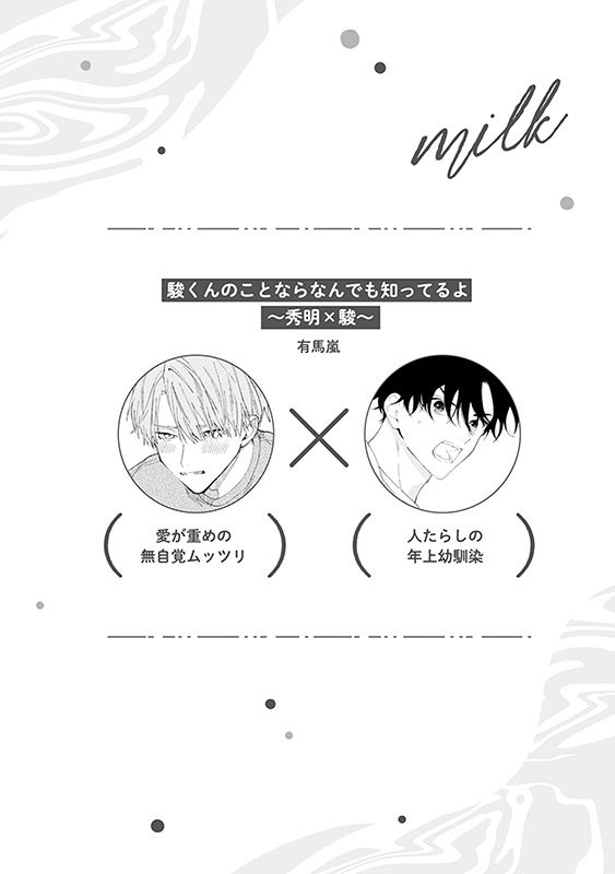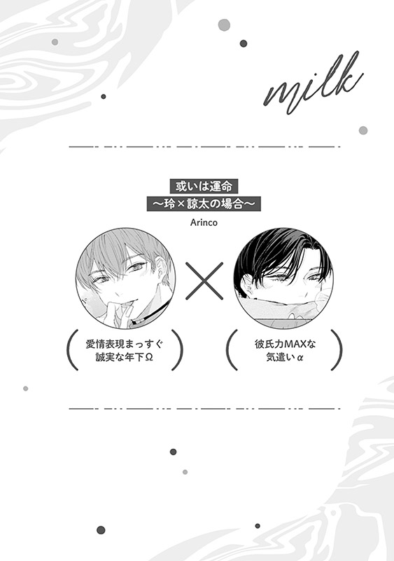 幼馴染の秀明と駿は、ある日悪ふざけの延長でキスをする。思いがけず照れた様子の駿に動揺する秀明だったが、その反応見たさに度々ちょっかいをかけるようになって…?・Arinco「或いは運命 ~玲×諒太の場合~」