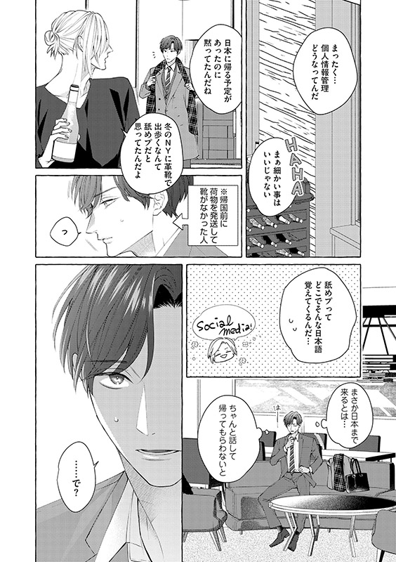 NYでの駐在を終えて帰国する前日、商社マンの日向は送迎会でしたたか酔い、その流れで出会ったイケメン米国人とワンナイトしてしまう。