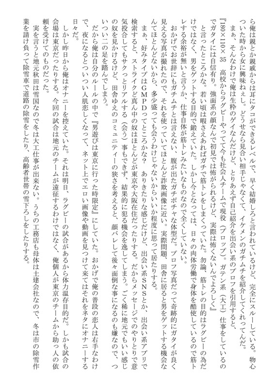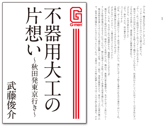 好評体育会シリーズ『肉○○主将』の武藤俊介が描く、ガテン系野郎の不器用な恋模様。月刊ゲイ雑誌・G-men No.225に掲載された、遠く離れた秋田と東京を繋ぐ、野郎同士のラブストーリーを配信!