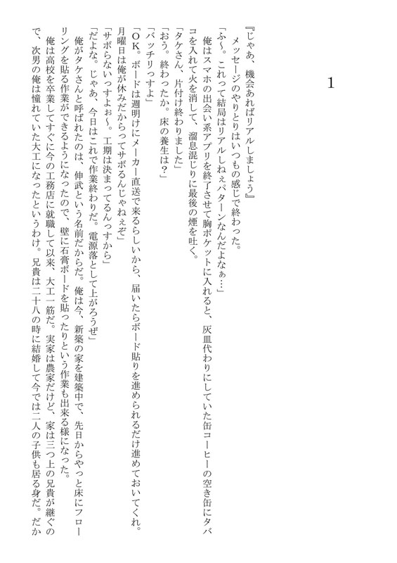 新幹線で秋田へと戻る道中、諦めきれないタケは掲示板を通じてヒデと連絡を取り合うようになる。メールを重ねるうちに明らかになる、住む世界の圧倒的な差――。代官山の高層マンションに住み、高級外車を乗り回し、肌の手入れすら怠らない都会のエリート。対して自分は、軽トラを転がし、汗と埃にまみれて働く田舎の大工。