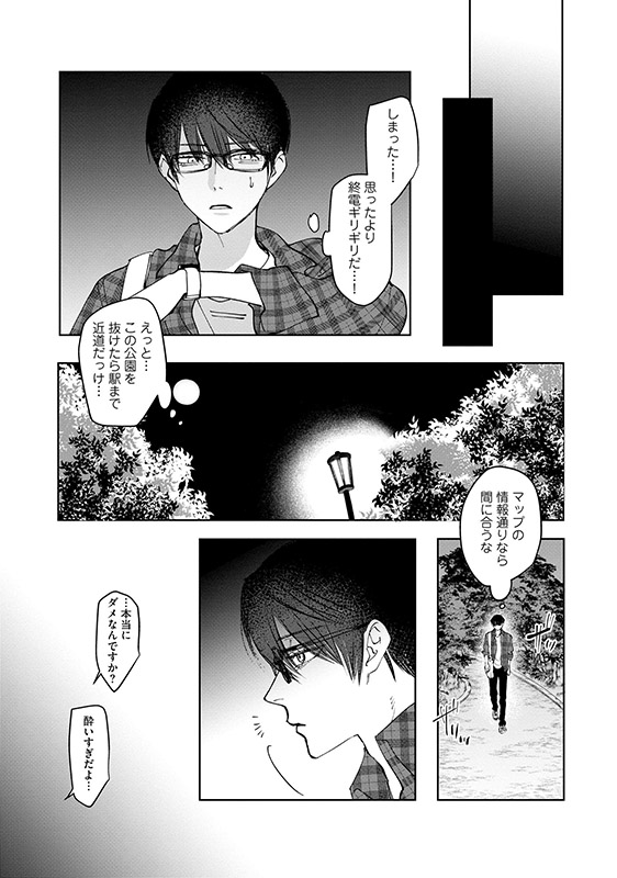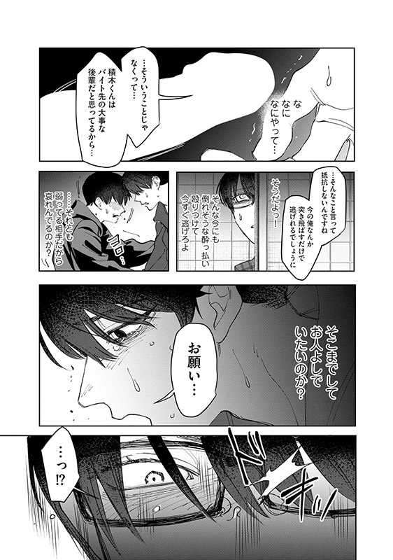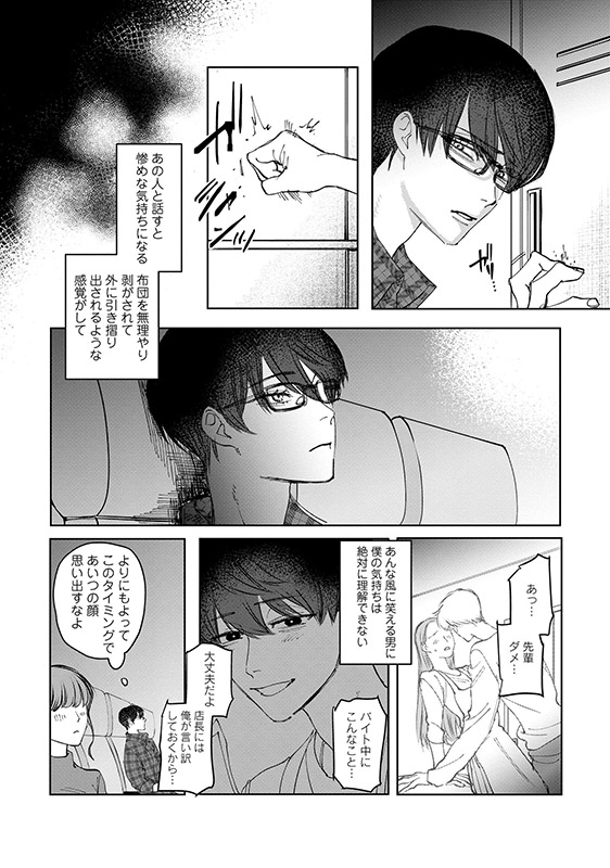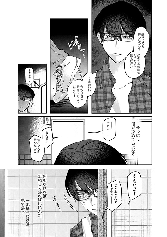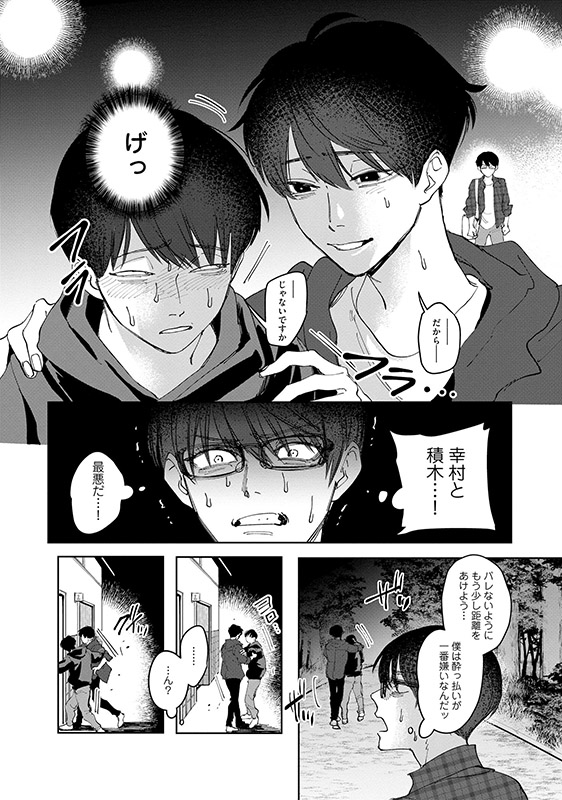 ある夜、桐江は通りがかった公園で幸村が男の後輩に襲われている現場を目撃する。咄嗟に助けを呼んだものの、幸村の縋るような表情に興奮し、自慰にふけってしまう桐江。