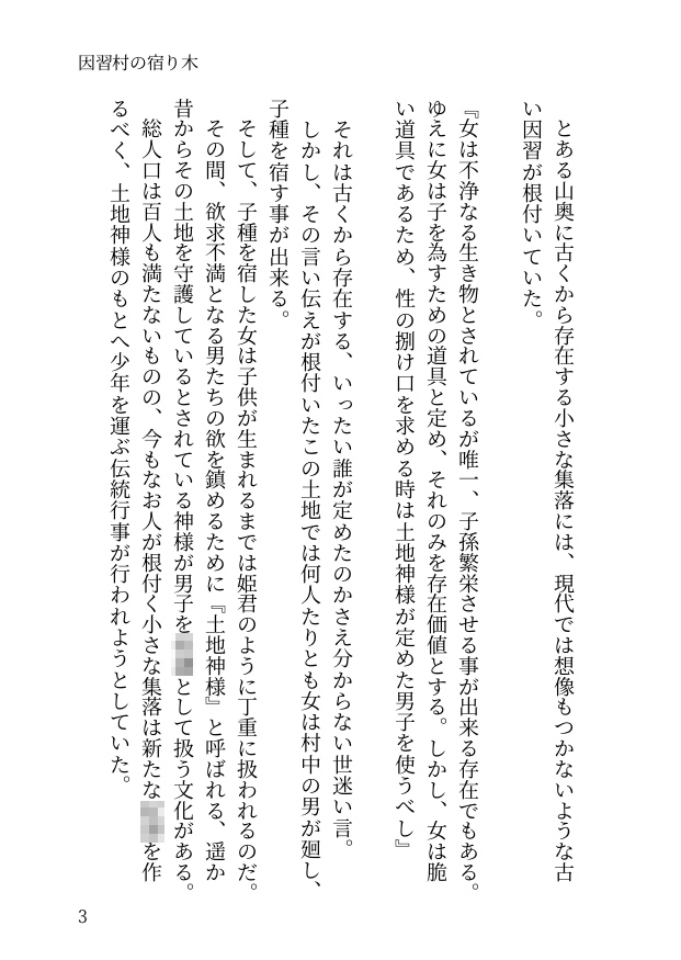 村の男たちが女を代わる代わる抱いて、○○を作るが女が早々に壊れないようにするべく、溜まった男たちの欲求を発散する為に存在する少年がいる。
