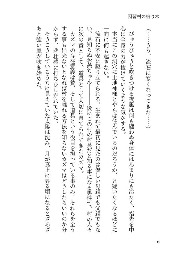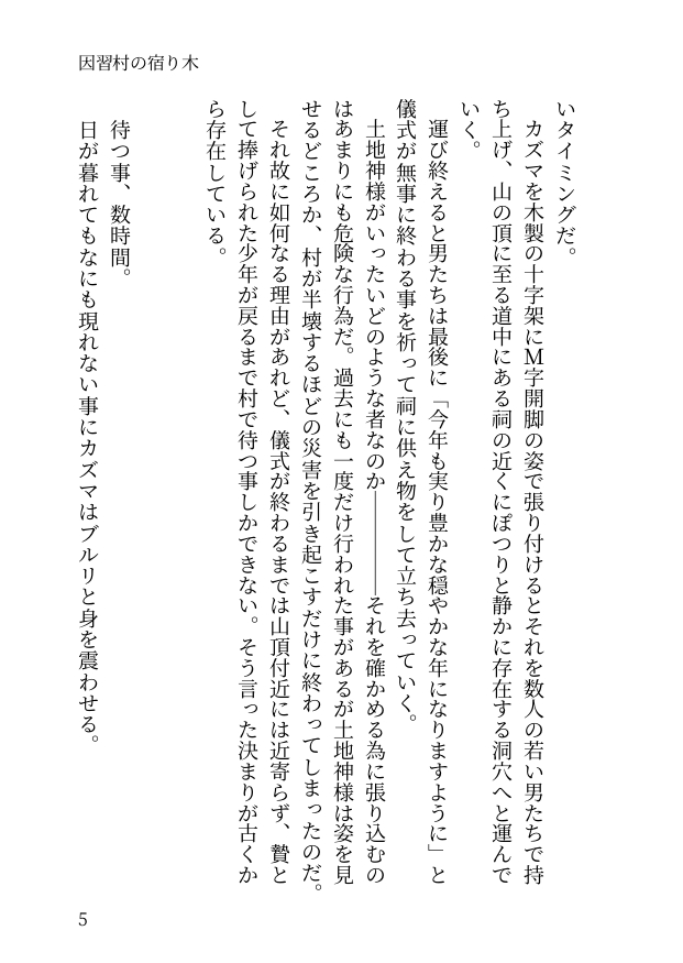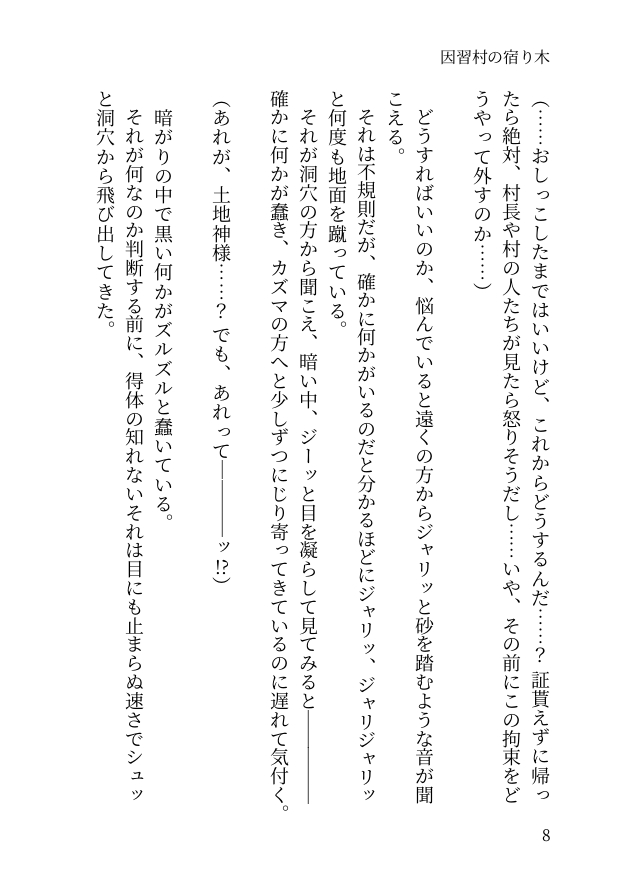 意識の境界線すらもぐちゃぐちゃにされ、カズマはいずれ土地神様に身を捧げる供物へと成り果てていく……。小説 24p(本文20p+表紙等4p)