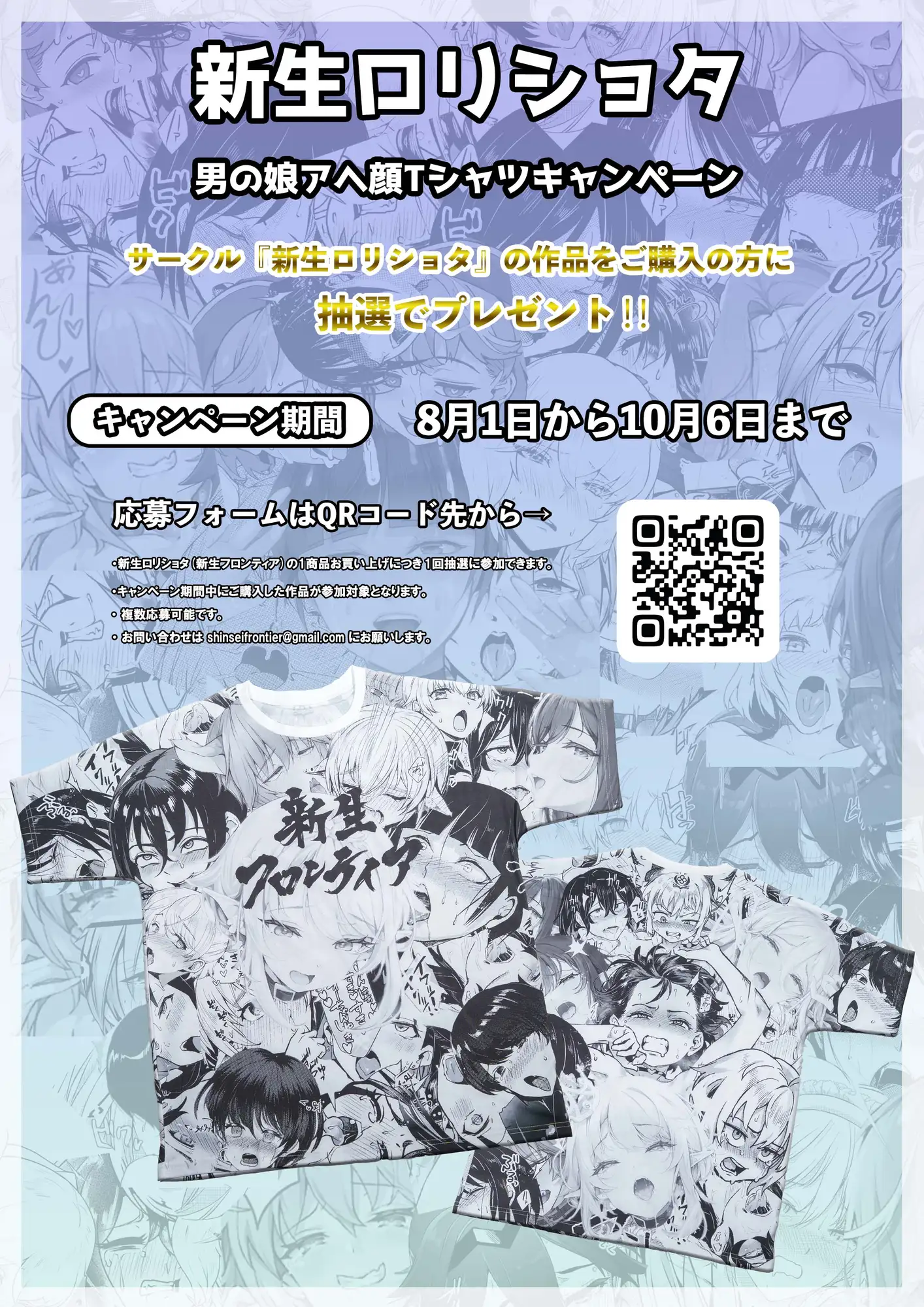 8月1日から10月6日まで男の娘アヘ顔Tシャツキャンペーン開催中抽選で3名様にshuffle、ヤドクガエル、桐下悠司、ジャイロウ、傷希レイなど