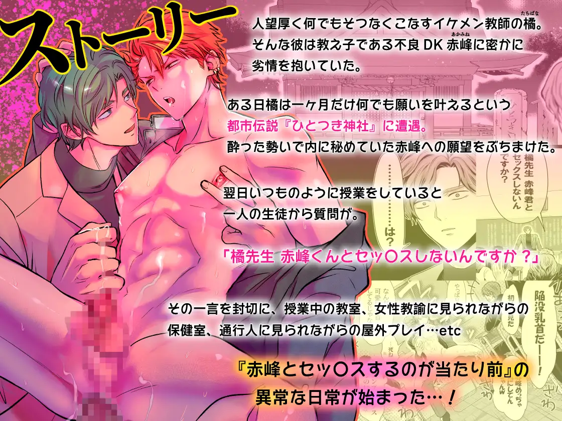 そんな彼は教え子である不良DK赤峰(あかみね)に密かに劣情を抱いていた。ある日橘は一ヶ月だけ何でも願いを叶えるという都市伝説『ひとつき神社』に遭遇。