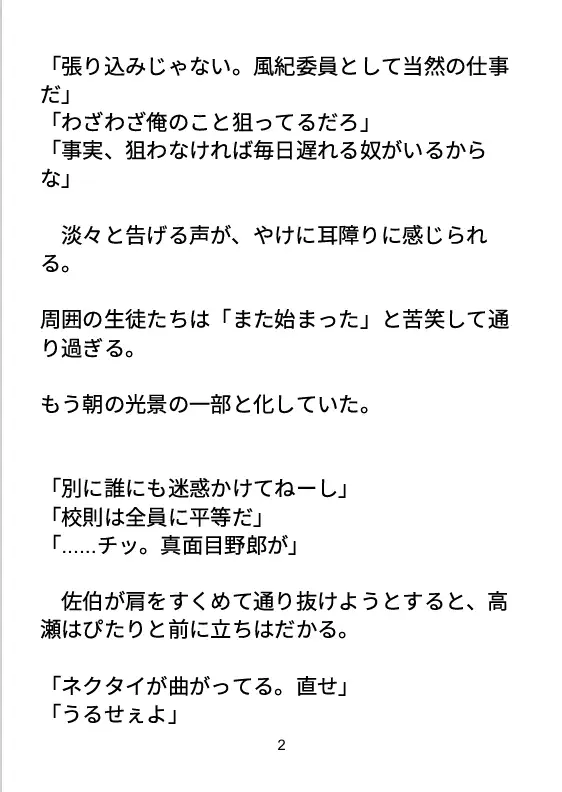 遅刻常習犯の佐伯翔と、彼を毎朝注意する風紀委員の高瀬優真。