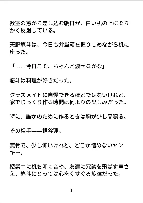 高校2年生の天野悠斗は、料理が得意な内向的な少年。クラスの人気者で無骨なヤンキー、桐谷蓮に密かに片思いをしている。