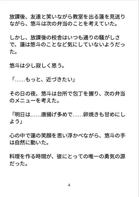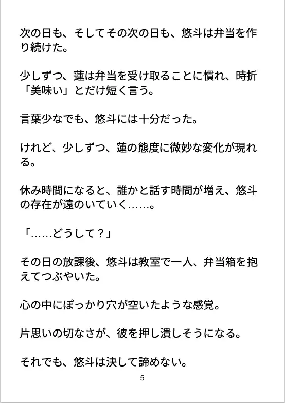勇気を出して手作り弁当を渡す日々を送る悠斗だったが、ある日、蓮が転校生の噂や友人関係のトラブルで少し距離を置くようになり、悠斗は胸を痛める。
