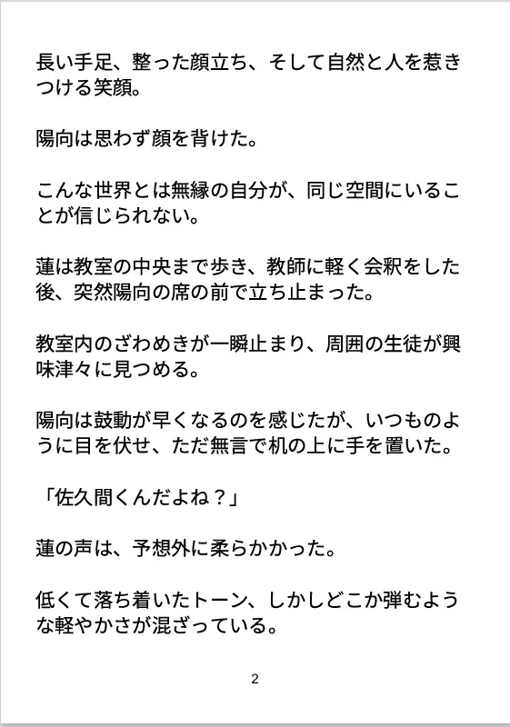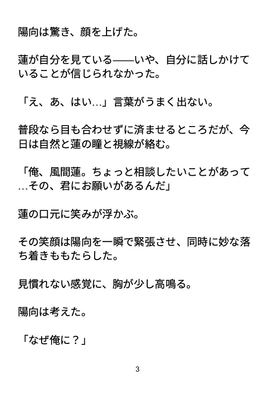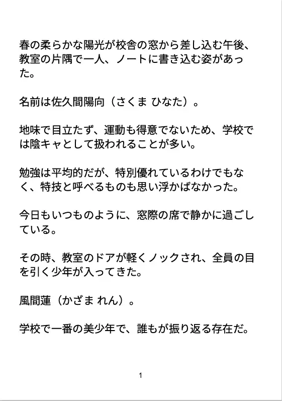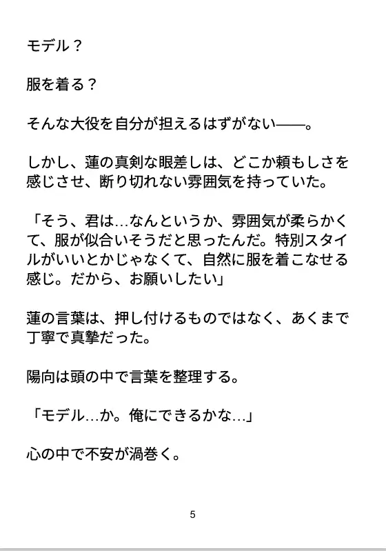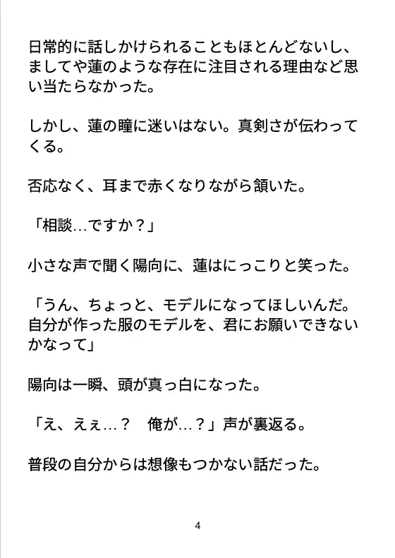 陰キャで平凡な日々を送る主人公の前に、学校で一番の美少年が現れる。美少年は将来ファッションデザイナーになる夢を持ち、自分のモデルになってほしいと頼んでくる。しかし、主人公は自分に自信がなく断ってしまう。