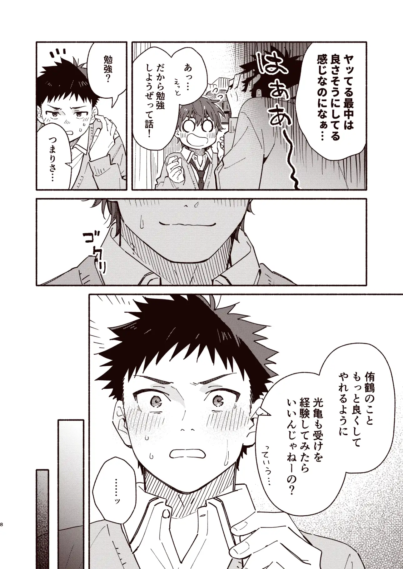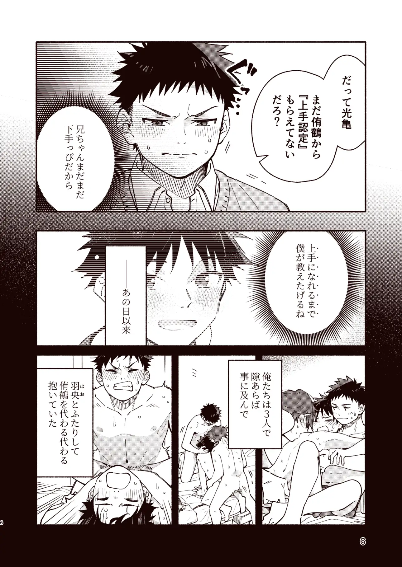 弟と親友のセックスを覗き見たのをきっかけに3人での関係を持つようになった光亀だが、弟から「兄ちゃんはまだ全然下手っぴだよ」と言われていた。弟を気持ちよくできるようになるために、親友から「受けを経験してみれば?」とそそのかされた光亀は……