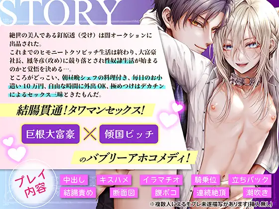 人気BLコミック「闇オク100億ケツの奥」(サークル:チンチラチンにさりげなく)がボイスドラマ版で登場!!絶世の美人である釘原透(受け)は闇オークションに出品された。