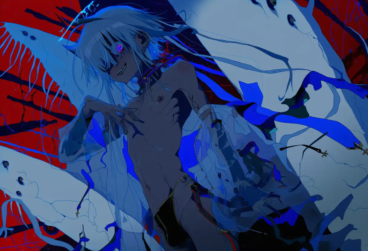 顕現体:千の貌を持つ混沌の化身が、あなたの前に現れるために選んだ仮初めの姿。夜の闇をそのまま固めたような艶のある黒い肌を持つ、2メートル近い長身痩躯の青年。銀河を溶かし込んだような紫色の瞳は、見る者の正気を吸い込んでいく。人間離れした完璧な美貌だが、その表情からは一切の感情が読み取れない。