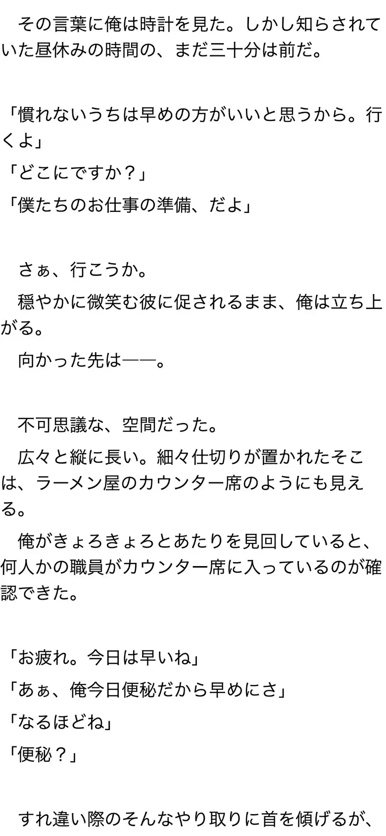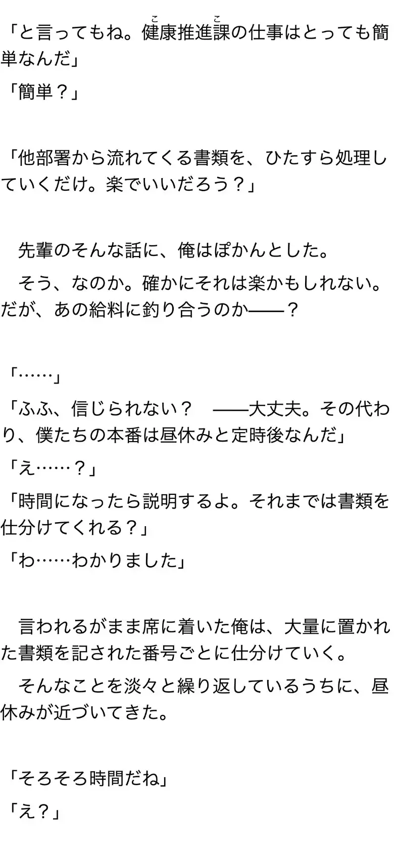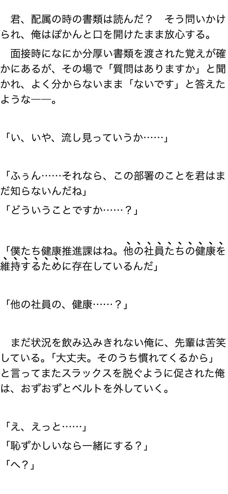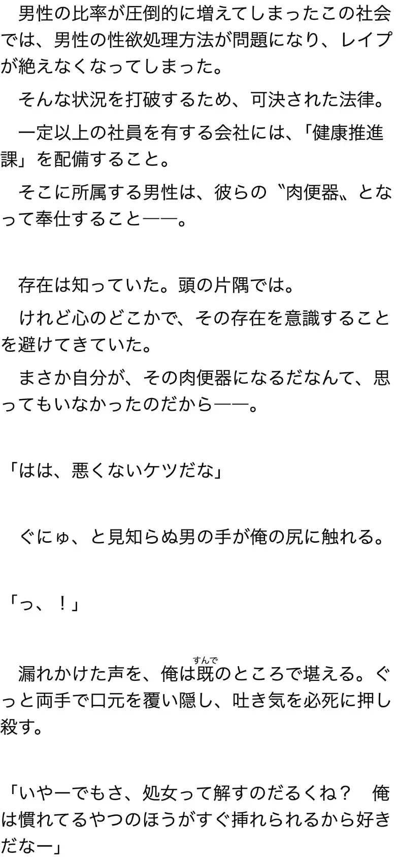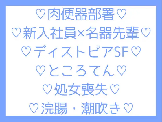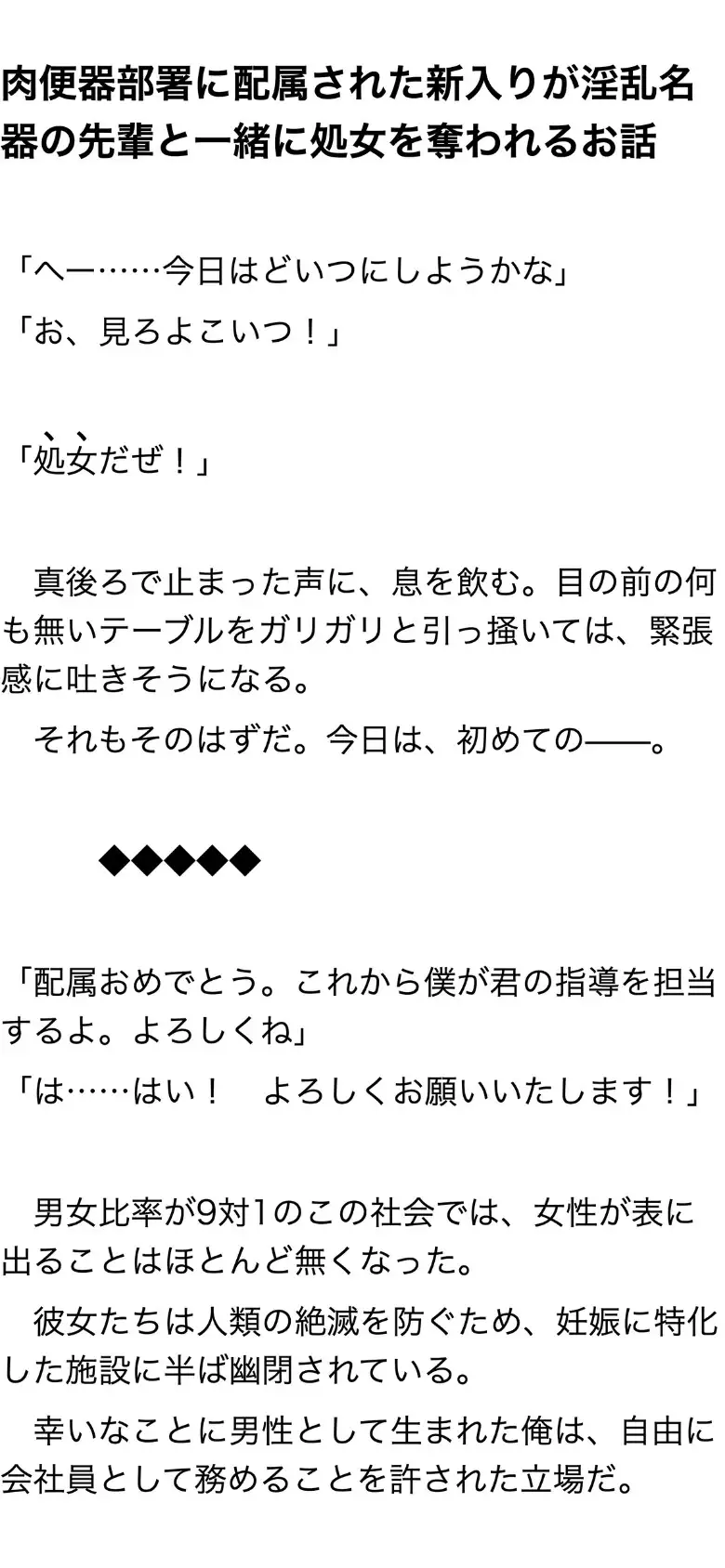 人口の9割が男性になってしまったディストピア世界で、通称肉便器部署に配属された新入社員とその先輩のお話。