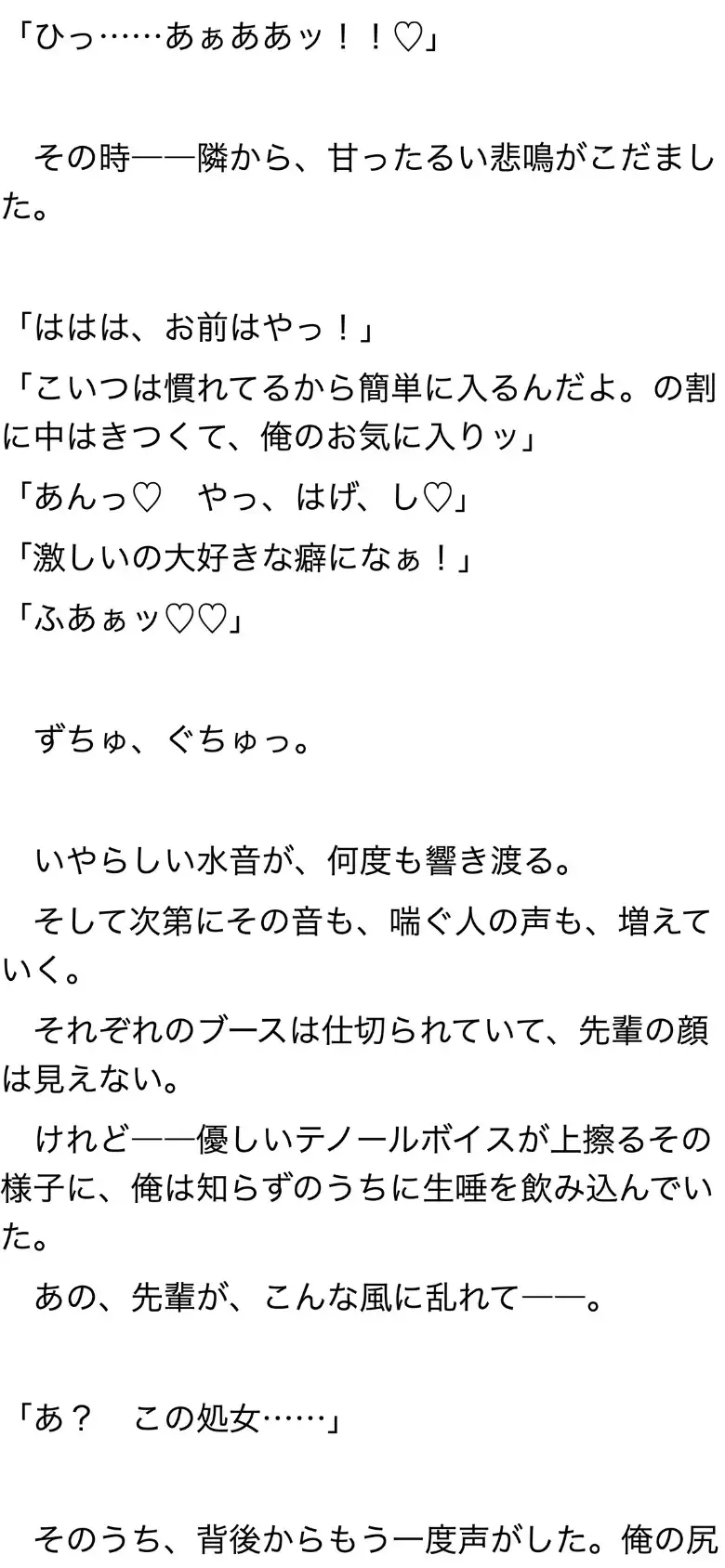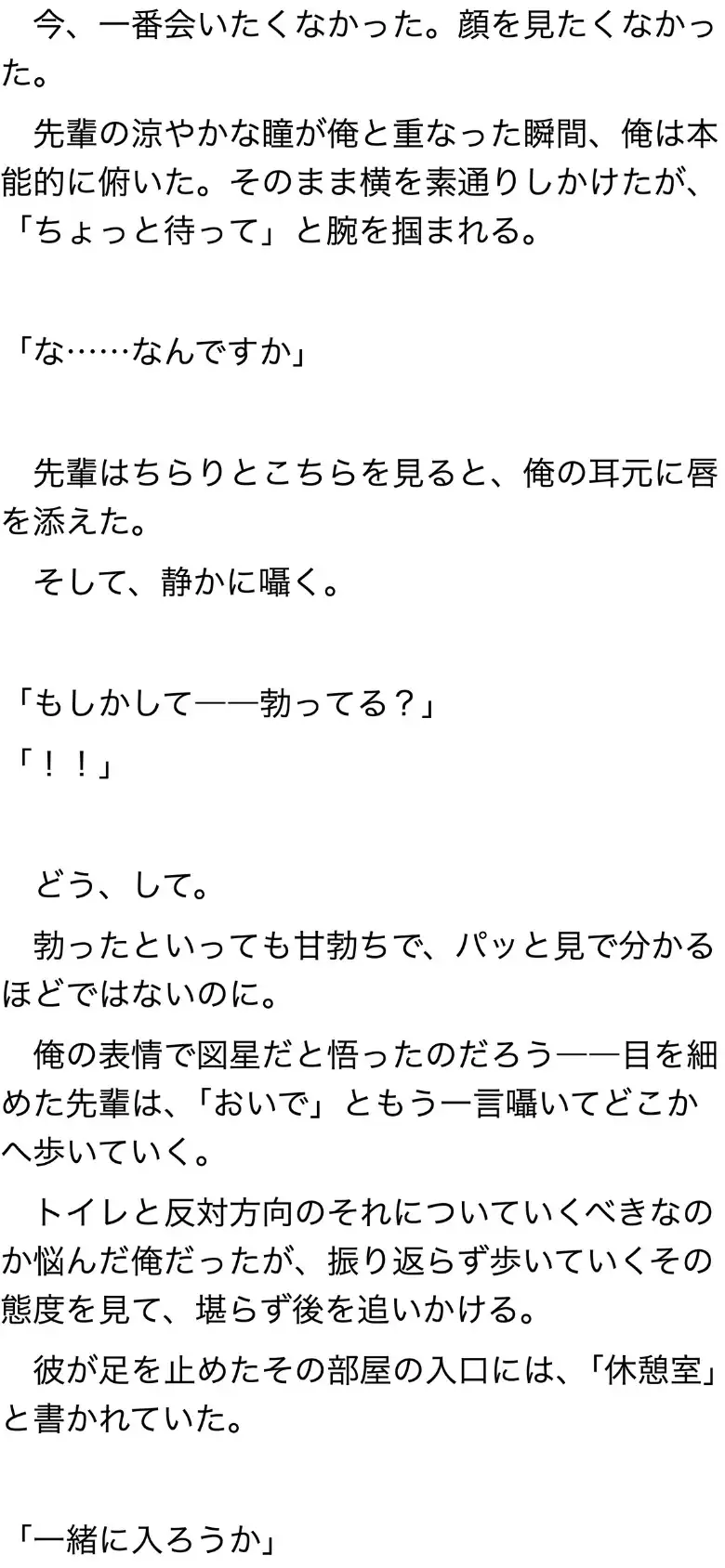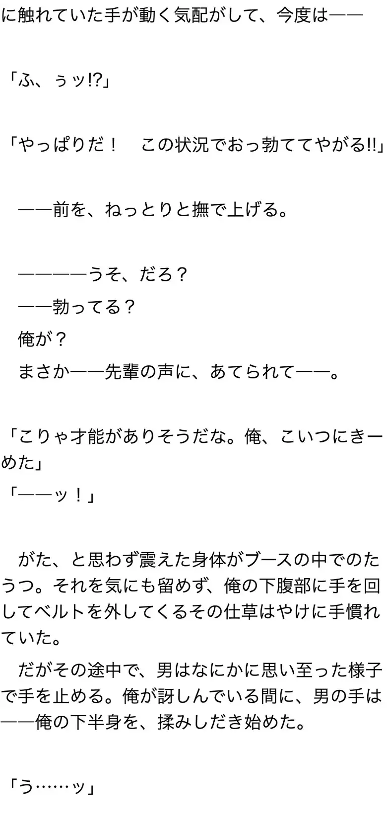 挿入を基準にして後輩×先輩としていますが、双方受けのイメージで執筆しています。文字数は16000字強です。