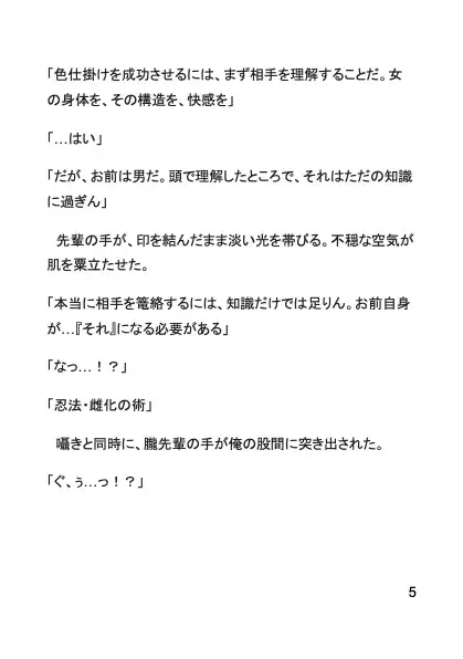 忍びの弟子・颯月に課せられた修行は「カントボーイ化の淫術」を会得すること。だがそれは、先輩忍衆の手で雌穴の快楽を叩き込まれる淫らな調教だった。乳首を弄ばれ、媚薬を注がれ、膣穴を道具で拡張され、先輩たちに何度も突き込まれる。精液を注がれ孕み腹を晒すたび、屈辱は甘い快感に変わっていく。