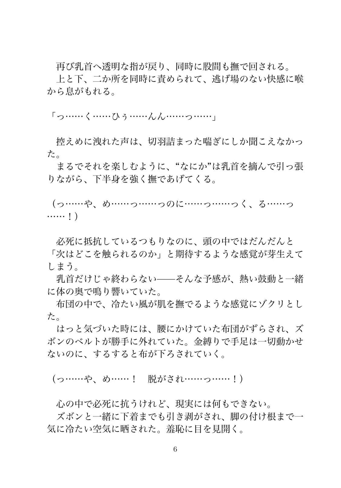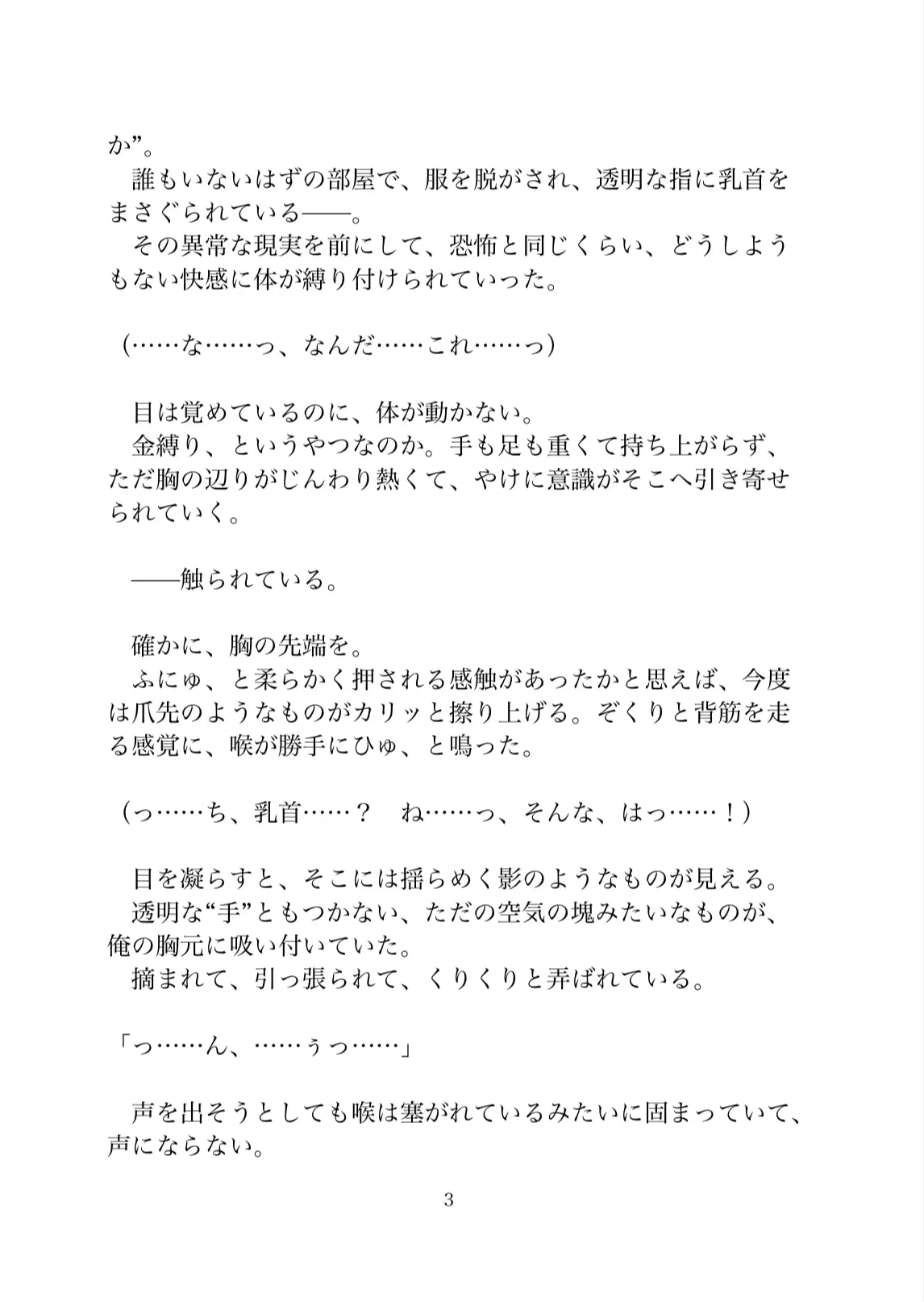 見えない何かに身体を弄られる大学生は、気付けば寝ている間だけじゃなくて日常的に犯されるようになってしまっていた。乳首や前立腺だけでイけるようになった身体、トイレの時に尿道を責められるのを待つようになってしまった身体……ダメだと思って御札を貼ってみたが効果はなく、むしろ怒らせて結腸まで犯されちゃう!?全文30000文字