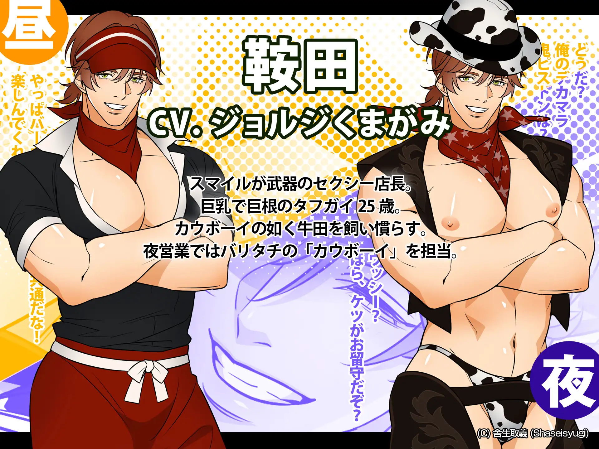 夜営業が始まると、店の雰囲気が一変する。キーワード:雄っぱい、乳首、巨根、無理矢理