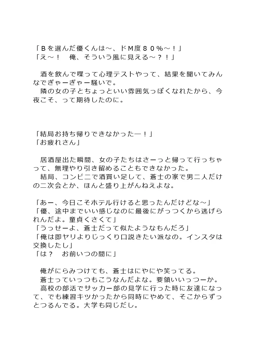 合コンの心理テストなどでいつもドMの回答を出す受け(Mの自覚無し)が、親友にメス堕ちさせられる話です。