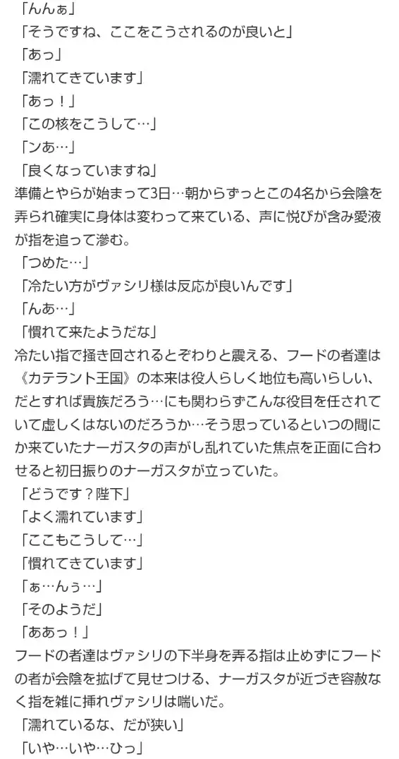 193センチ 襟足が長いくすんだ金色の髪と薄茶色の瞳の整った容姿フードの者達:儀式の為にヴァシリを慣らす 《カテラント王国》の補佐官達 命令に忠実な臣下達