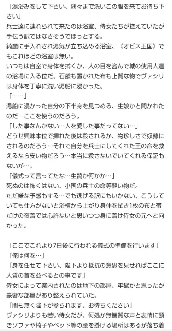 《アタラクシア》という世界、大国との戦に敗北した小国の兵士ヴァシリは王族を人質に取られ《カテラント帝国》に連れて行かれ、そこで国王ナーガスタの王妃として儀式を受ける為の慣らしを施される。