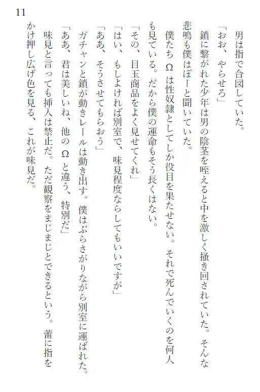 Ω・β・α――その区分は、かつて研究施設によって定められ、いまや国家制度として人々の人生を縛っていた。最も多いΩは、豊富に存在するがゆえに卑しまれ、とりわけ〈男Ω〉は珍しさと同時に忌避の対象とされる。彼らは幼くして奉仕や下働きを強いられ、十○歳を迎えると〈モア〉と呼ばれる発情期を迎えるため、ひときわ貴重な存在とされた。多くは貴族や王族のもとに引き取られ、番としてではなく、欲望を満たすための道具としてその身を捧げさせられる。だがその日を迎える前に命を落とす者も多く、「十歳まで生きられれば幸運」とまで囁かれていた。