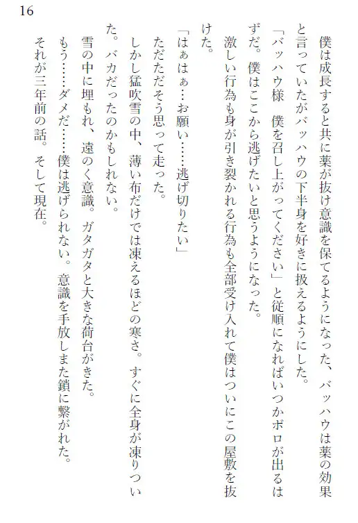 囚われの身、冷たい寝床に鎖で繋がれ寿命も10歳まで生きられればいいほうとまで言われている。その中でも1○歳まで生きた高貴な○供を「モアΩ」というこの話の中で貴重な存在になる。