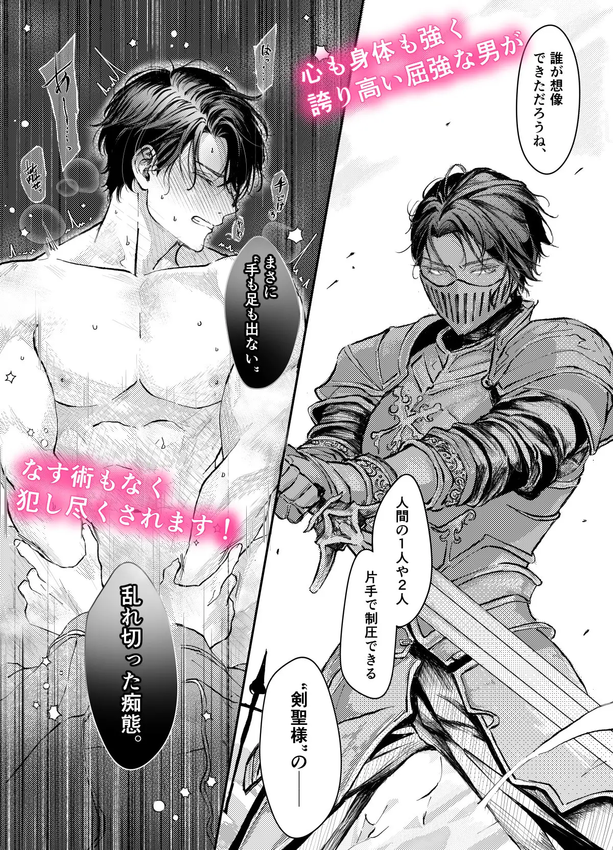 「プライドの高い社会的強者男性が、徹底的に責められながらも、堕ちる寸前で抗い続ける騎士」を描いています。Pixiv公開分をベースに、加筆修正+性癖に忠実な描き下ろしエロシーン16pを収録。