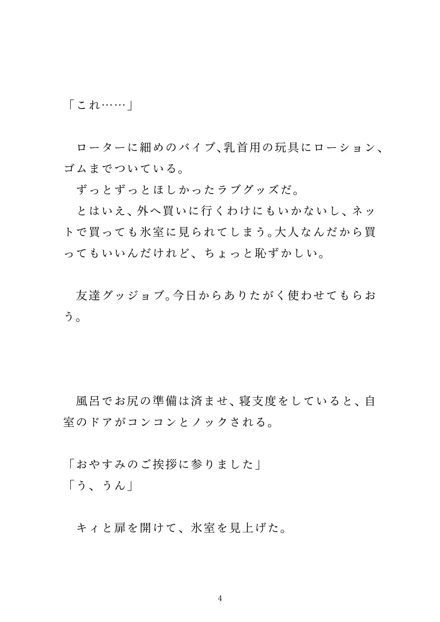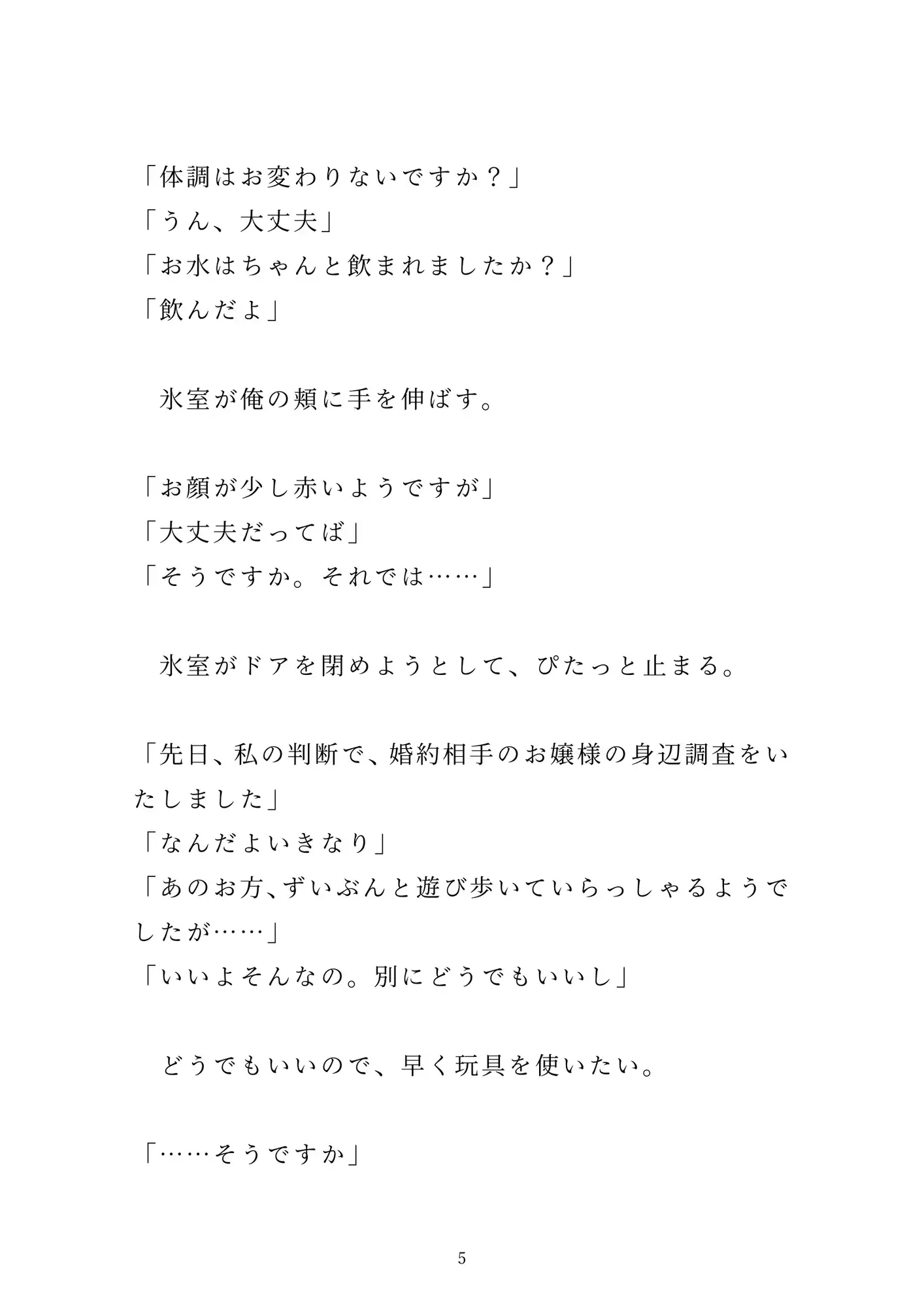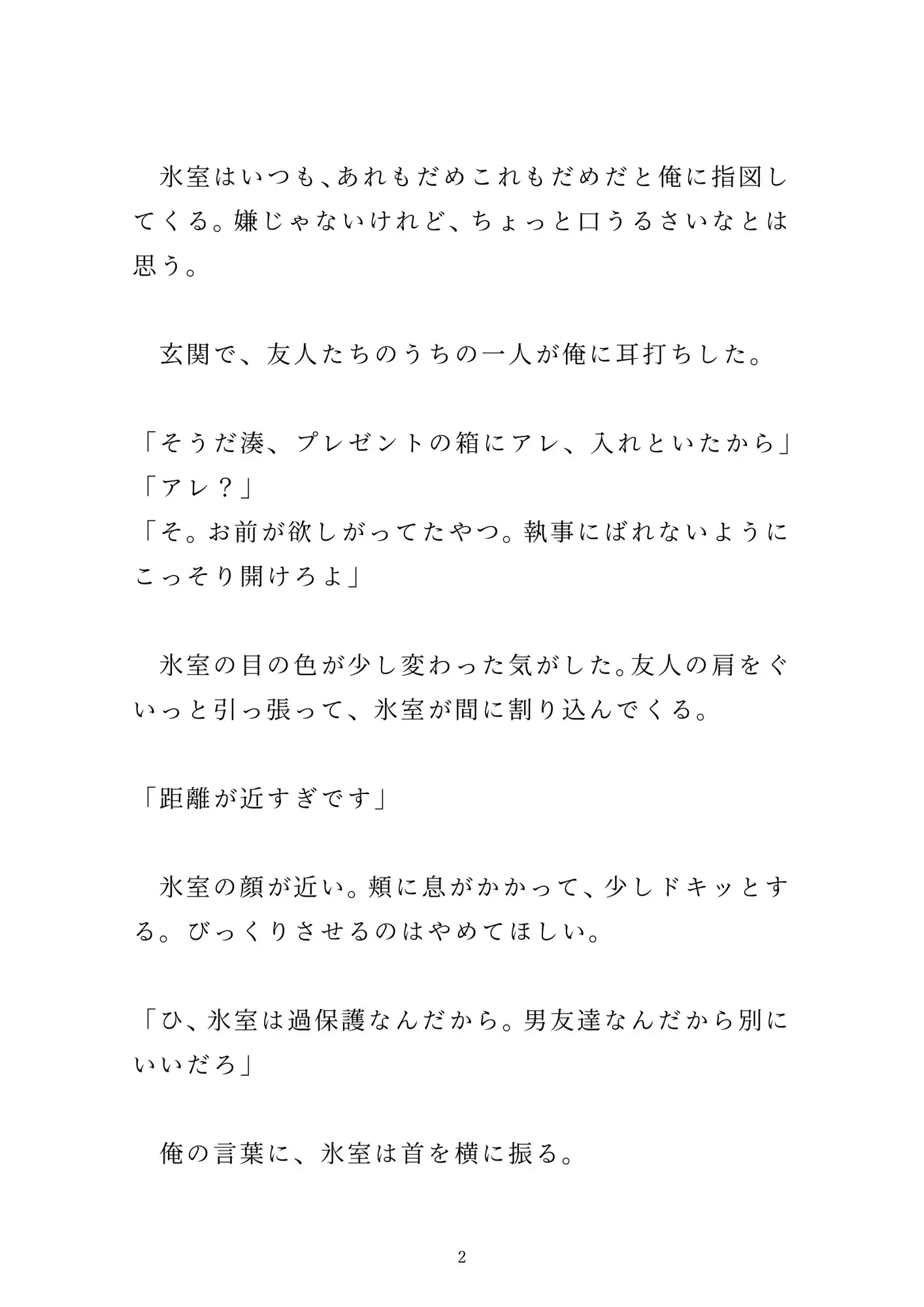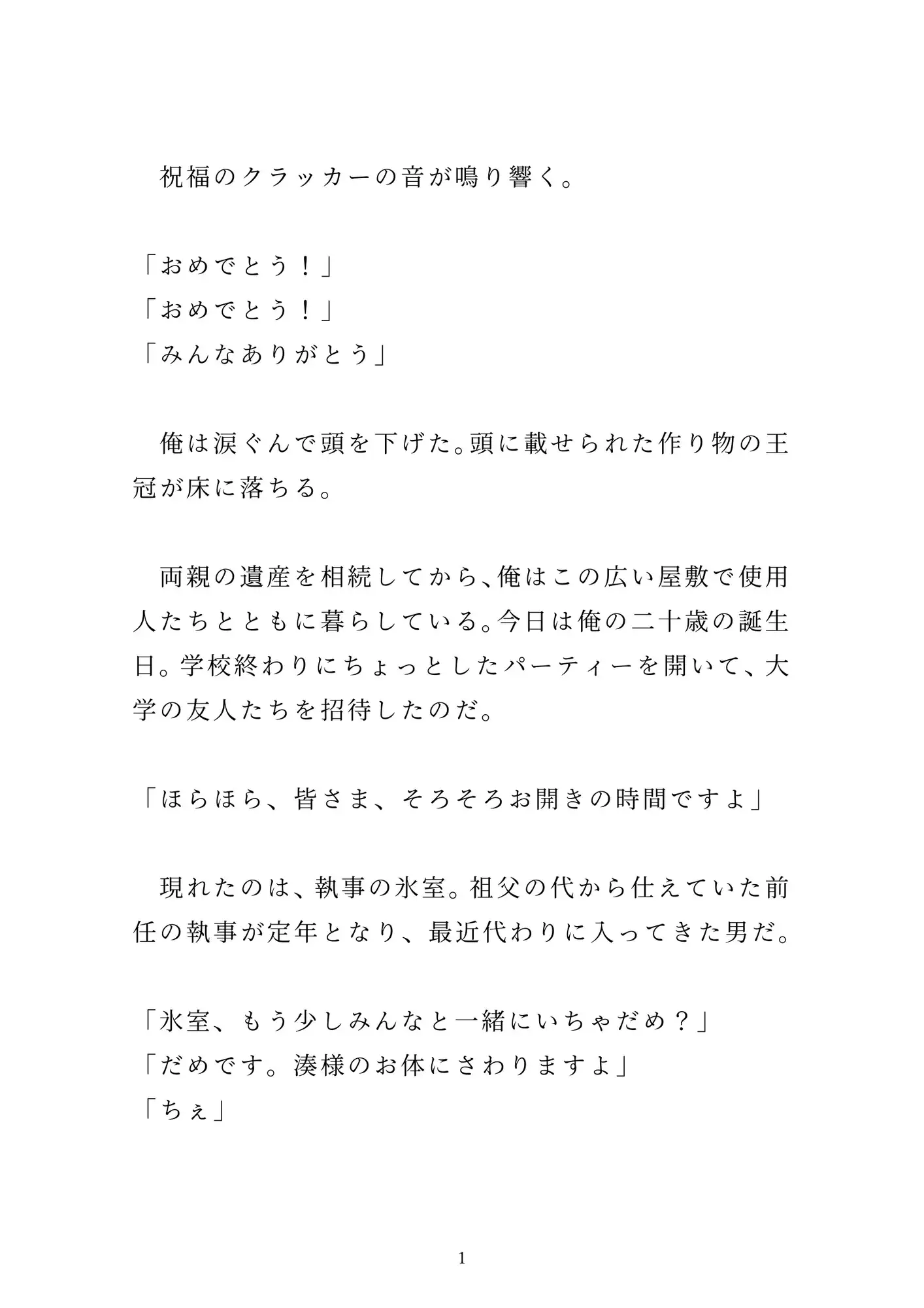 お金持ちの大学生・湊は、二十歳の誕生日に友人から冗談めかして大人の玩具を贈られる。興味本位でこっそり使ってみた湊は、初めて味わう快感に翻弄され、お漏らしするほど乱れてしまう。しかし、その姿を執事・氷室に見つかってしまう湊。