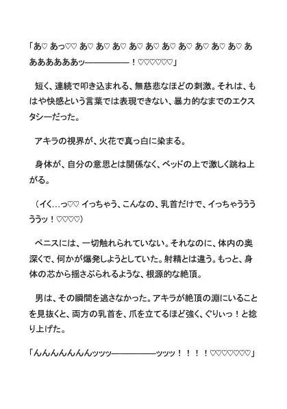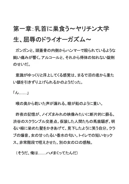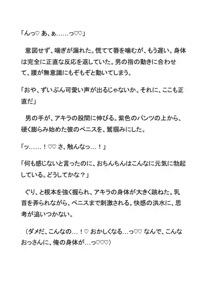 ハロウィンの渋谷。悪役のコスプレに身を包んだイケメン大学生のアキラは、精力剤をキメて女を食い荒らす、まさにやりたい放題のヤリチンだった。しかし、酔いから覚めると、見知らぬ高級ホテルのベッドの上。目の前には、穏やかな笑みを浮かべたおじさんがいた。20万円のホテル代を突きつけられ、断れないアキラ。最初は「上半身を触らせるだけ」という屈辱的な条件だったはずが、おじさんの執拗な愛撫で、アキラの身体は未知の快感に目覚めていく。今まで感じたことのなかった乳首が開発され、プライドの高いヤリチンの身体は、意思に反して熱く疼き始めてしまう。