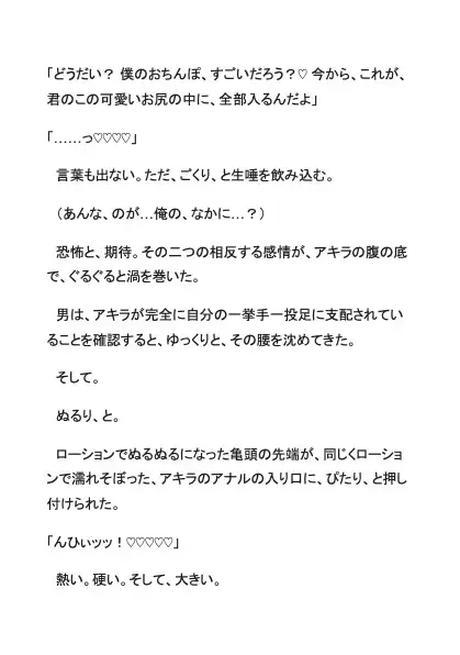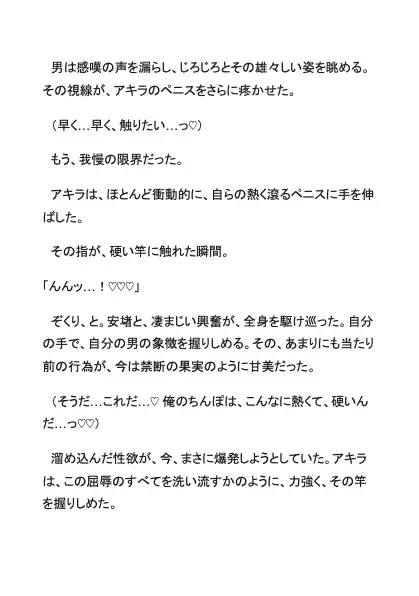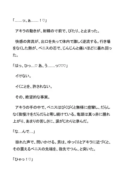 「イかせてやる」という言葉を信じ、男の前でオナニーをさせられるアキラ。だが、それは射精寸前で必ず止められる、地獄の寸止め射精管理調教の始まりだった。何度も絶頂を阻まれ、快感と苦痛の狭間で理性を失っていく。やがて、おじさんの雄々しい巨根を前に、アキラは涙ながらに敗北を認め、自ら快感を求めるようになっていく──。
