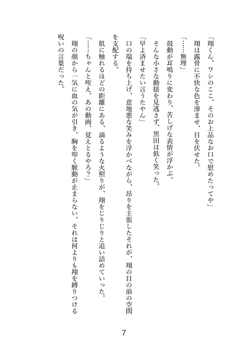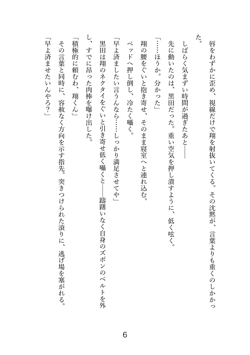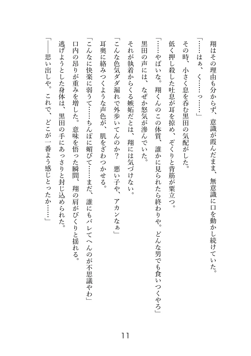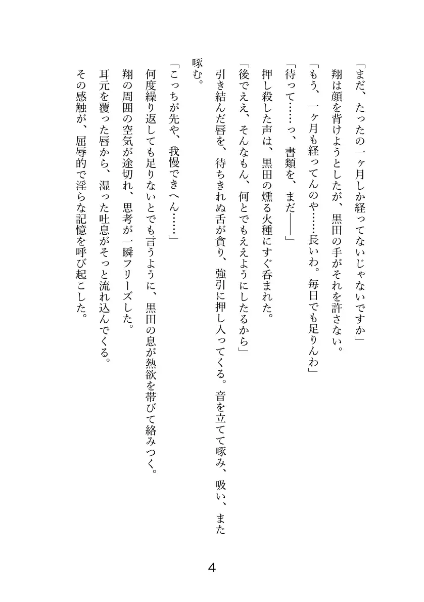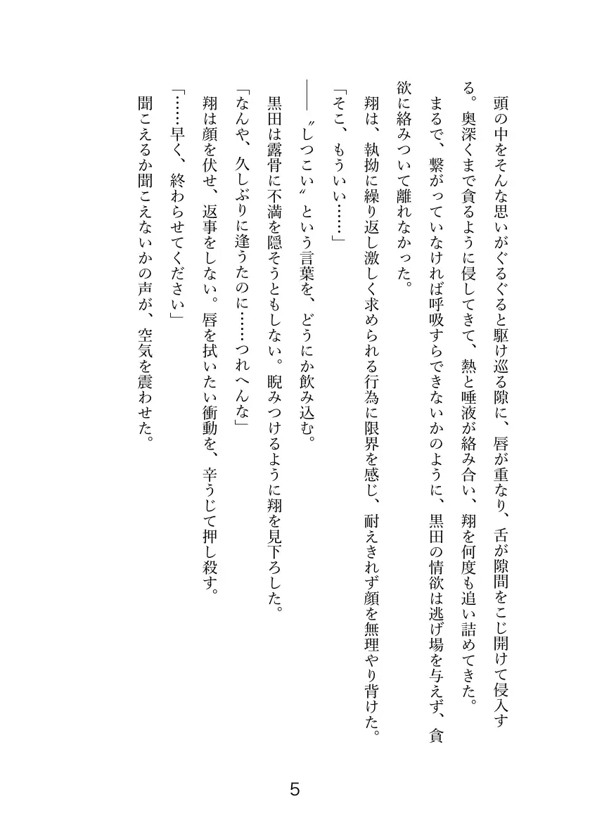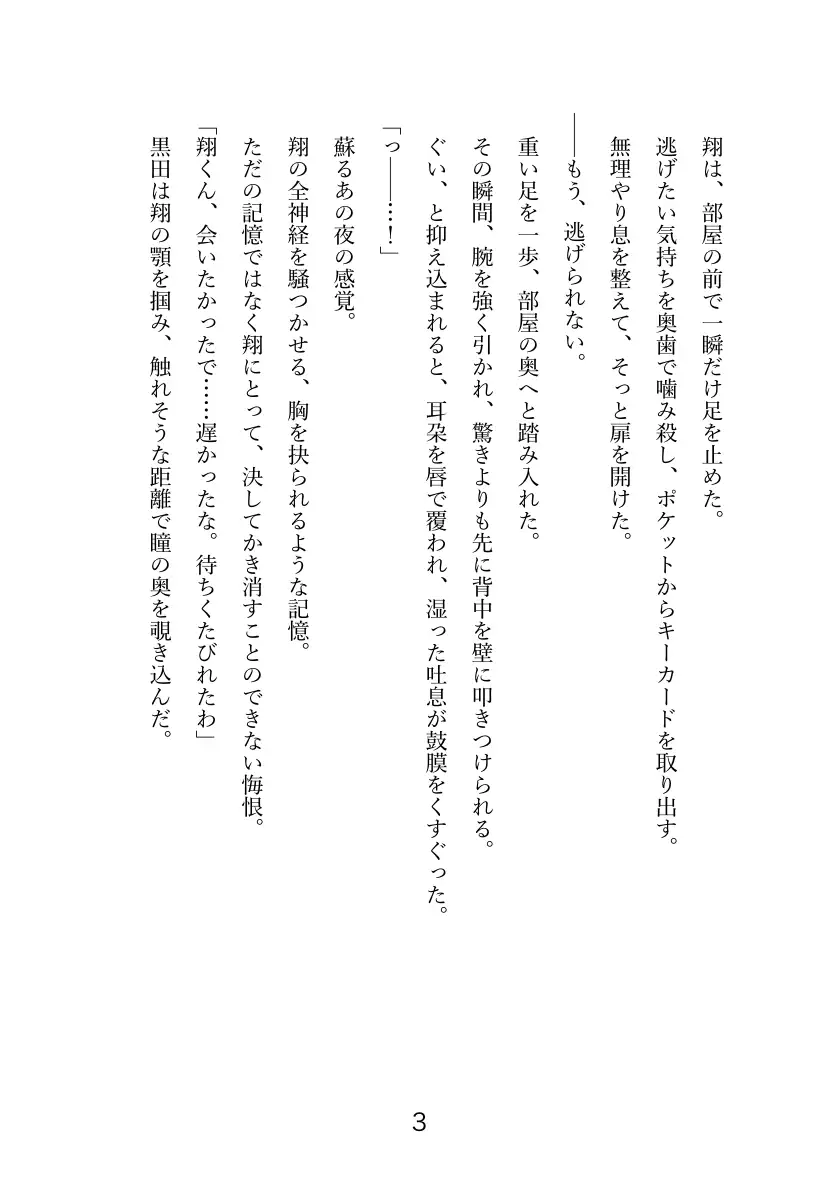 黒田からの執着に必死で抗うが、弱みを握られ逃げられない立場に。しかし、いつしかそれだけが理由ではなくなり、与えられる快楽に理性までもが飲み込まれていってしまう。