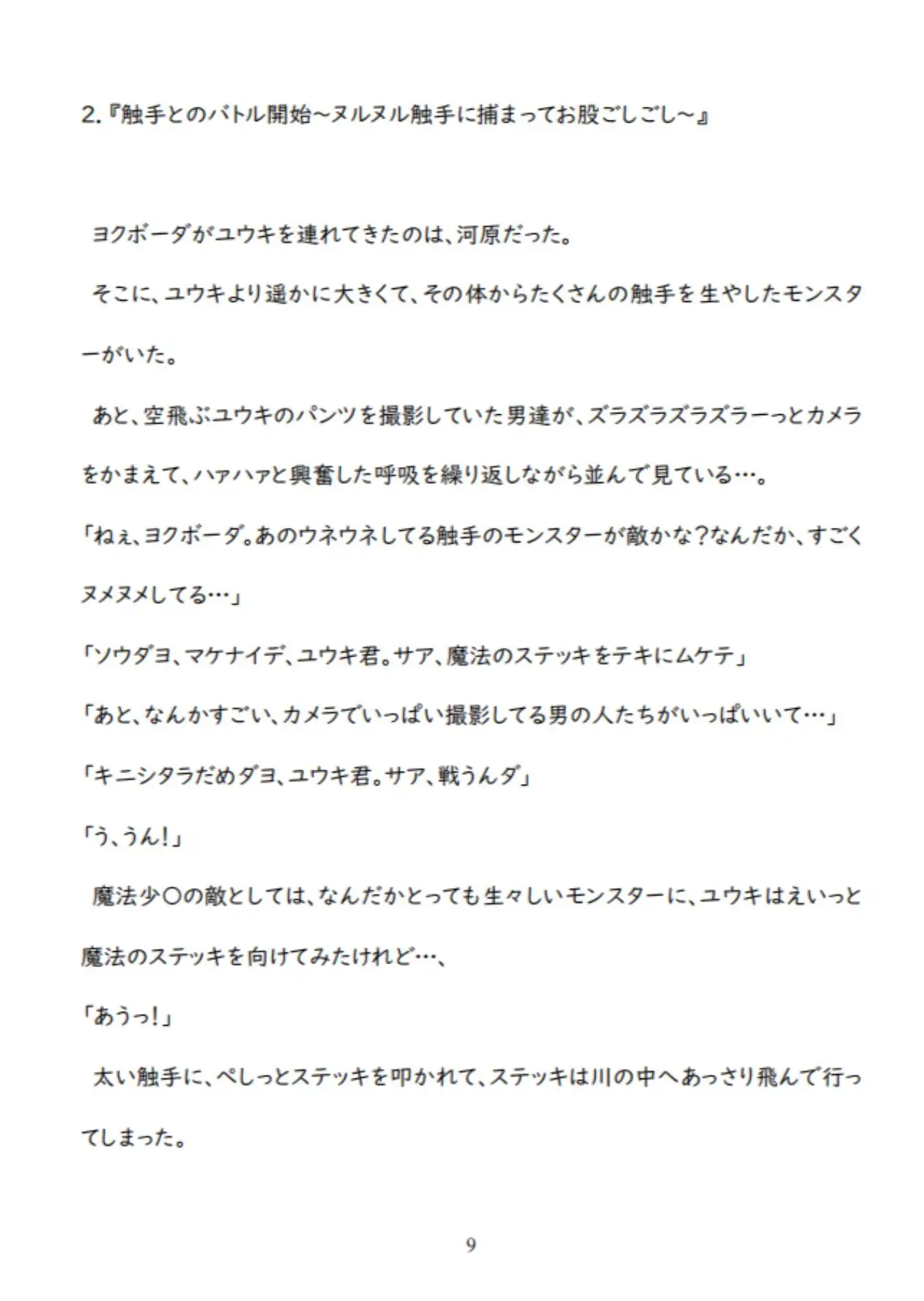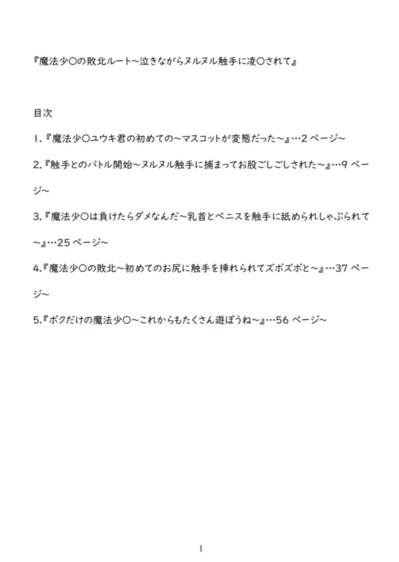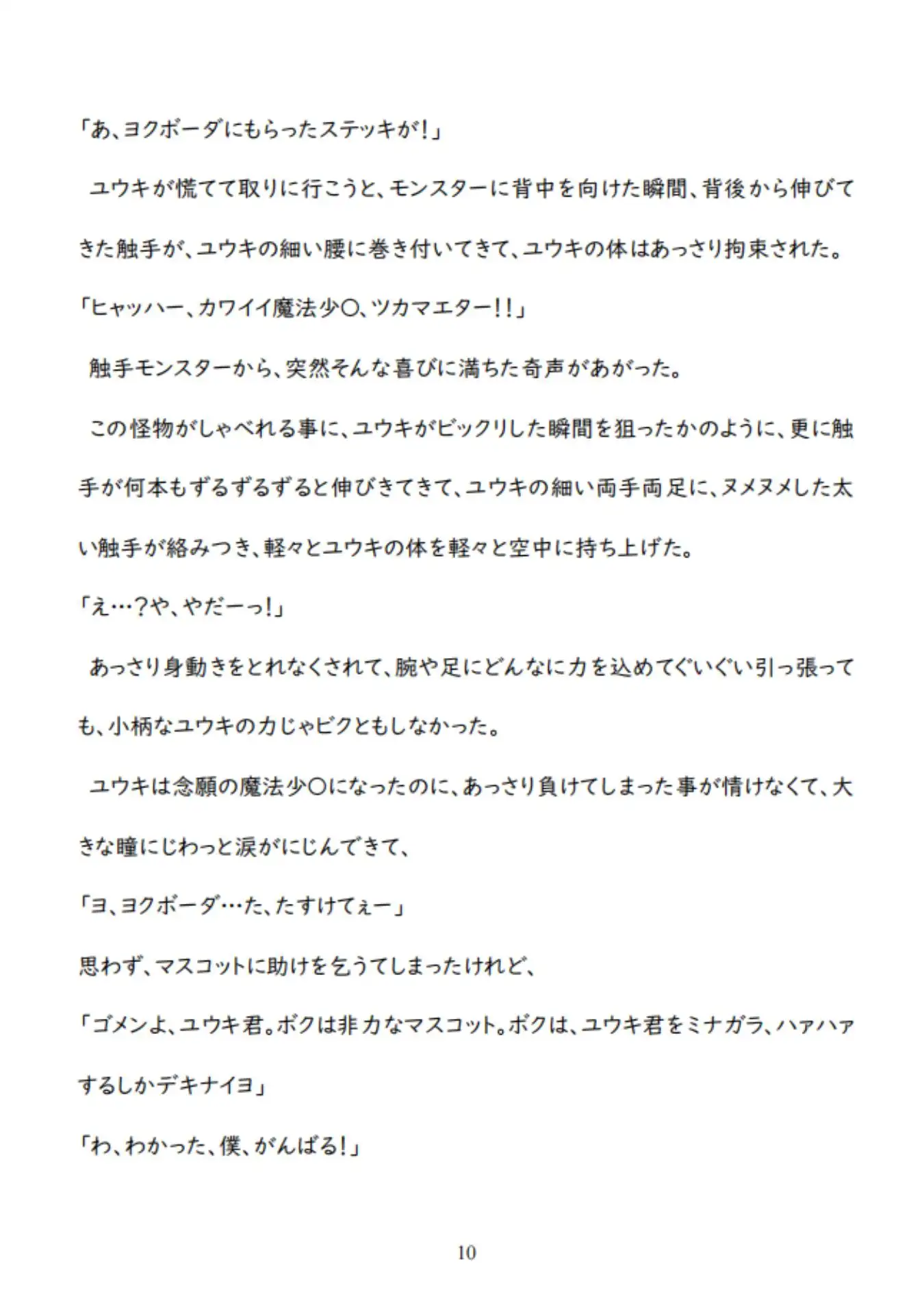 魔法少〇に憧れている健気で純粋な少〇が、垂れ耳のマスコットに騙されて、魔法少〇の力を持てたと信じ込まされて戦いに連れ出され、触手モンスターの触手に犯されまくる、魔法少〇の敗北凌○ルートの物語。全身を触手に巻かれ、両手両足を触手に拘束され、身動きが取れない状態で周囲に見せられながら、射精も初めての主人公が、無理やり性的刺激を与えられ、触手の体液で濡らされながら、全身を弄ばれ続けて、初めてのお尻の穴まで触手に…。