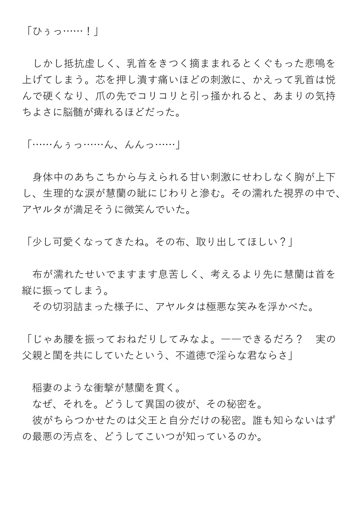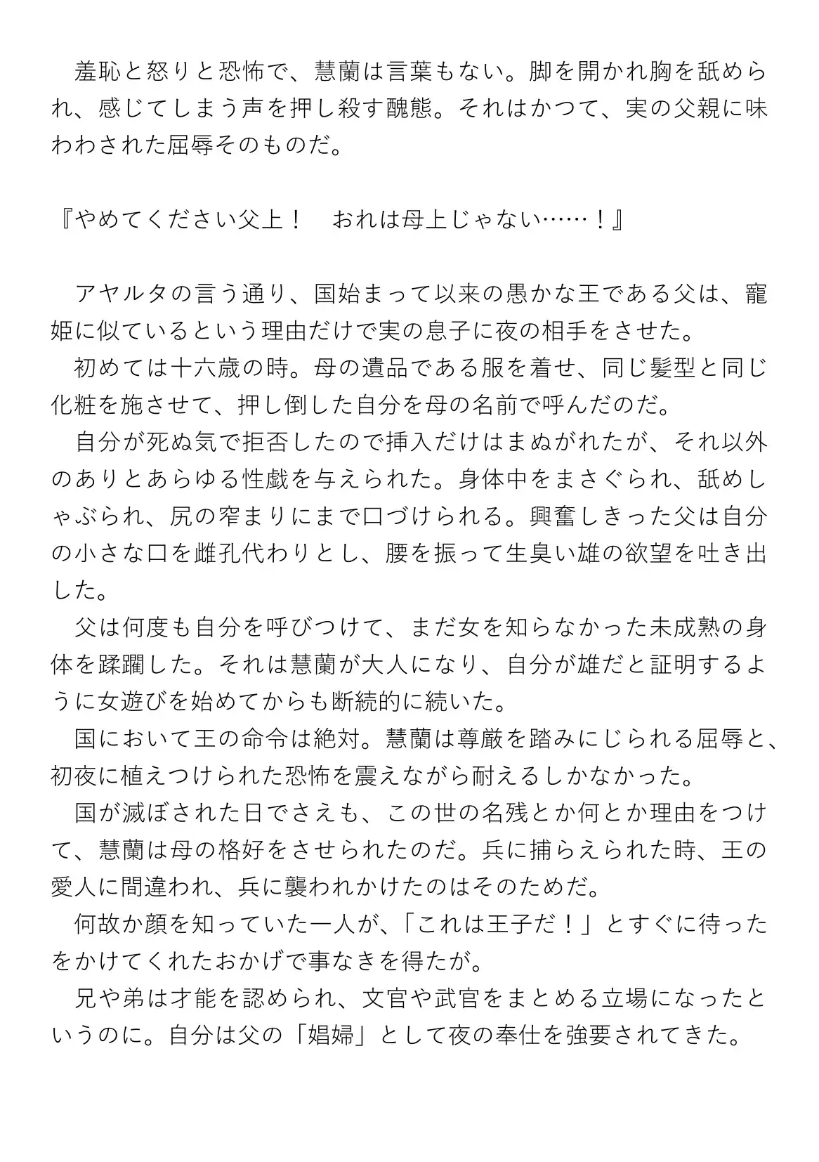 ◆慧蘭(けいらん)(受) 藹国第二王子。誰に対しても横暴な態度をとり、女遊びや身勝手な振る舞いが目立つ王族の鼻つまみ者だったが、それらは全て優秀な兄と弟(第一王子と第三王子)への激しい劣等感の裏返しであり、父王への当てつけだった。
