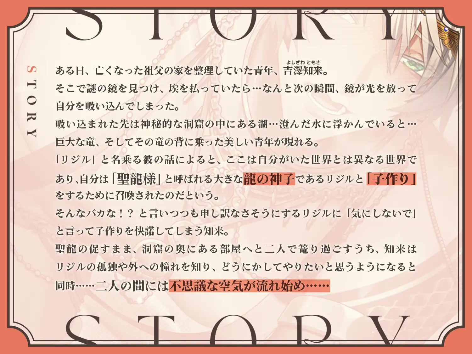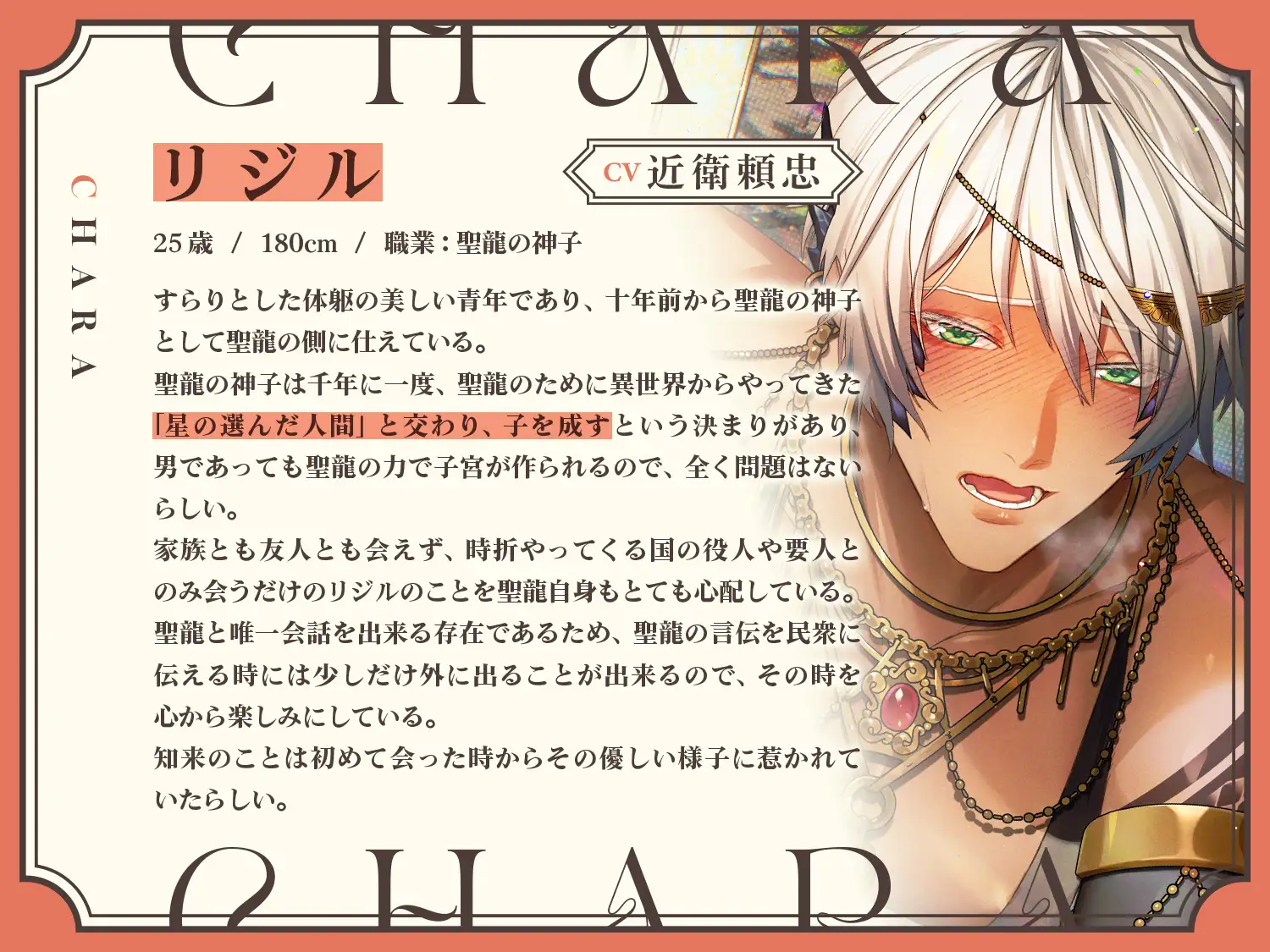 聖龍の神子は千年に一度、聖龍のために異世界からやってきた「星の選んだ人間」と交わり、子を成すという決まりがあり本来であればリジルの姉が仕える筈であったが姉のことを不憫におもったリジルが代わったという事情があった。