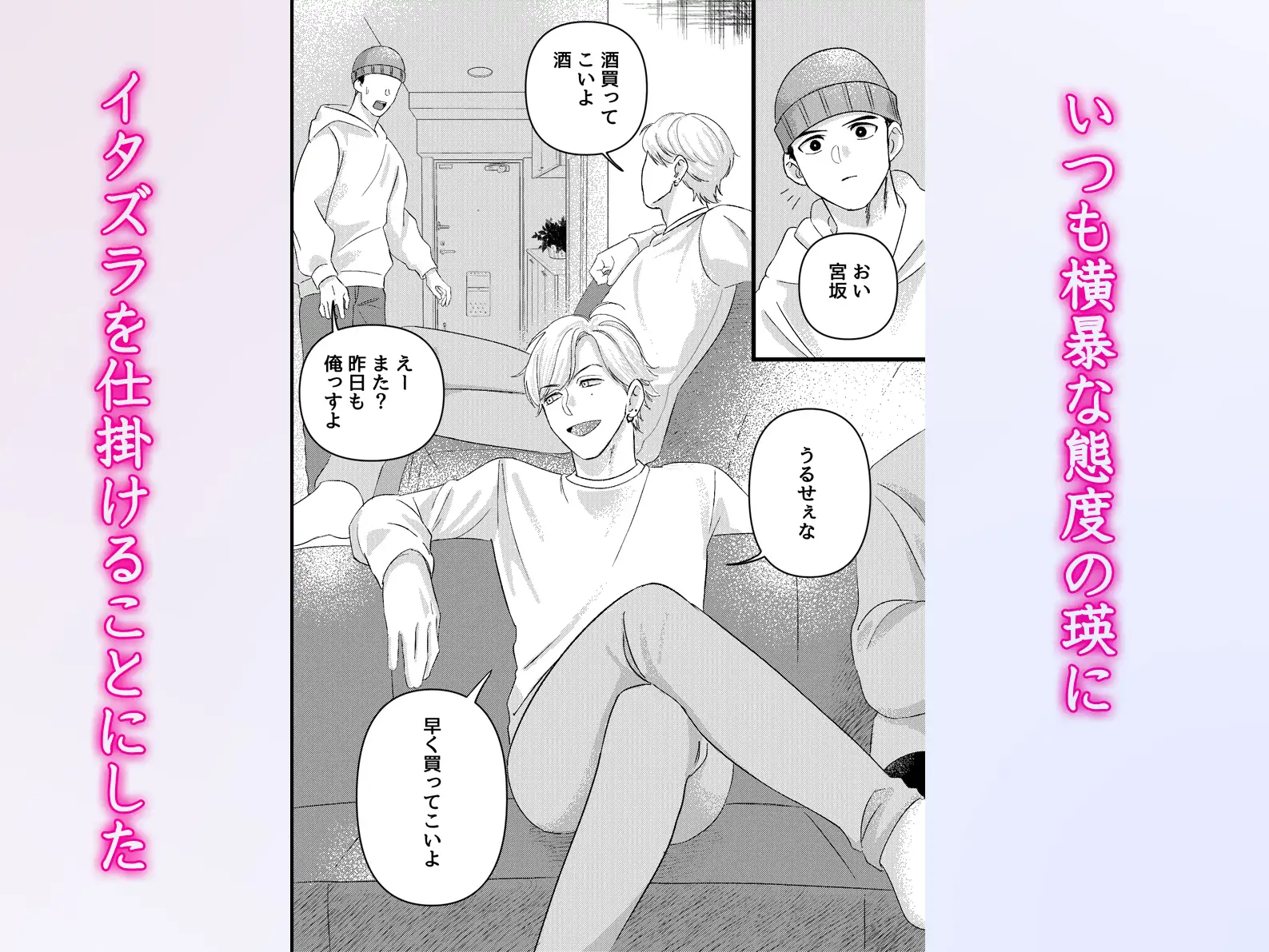 その瞬間、零の硬く熱いち○ぽが口内深くねじ込まれ、瑛は怒りながらも喉奥まで押し込まれる感触に股間が疼き始める。そこへパシらされていた宮下が戻ってきて、零のモノにむしゃぶりつく瑛の姿を目撃し、衝撃を受ける。