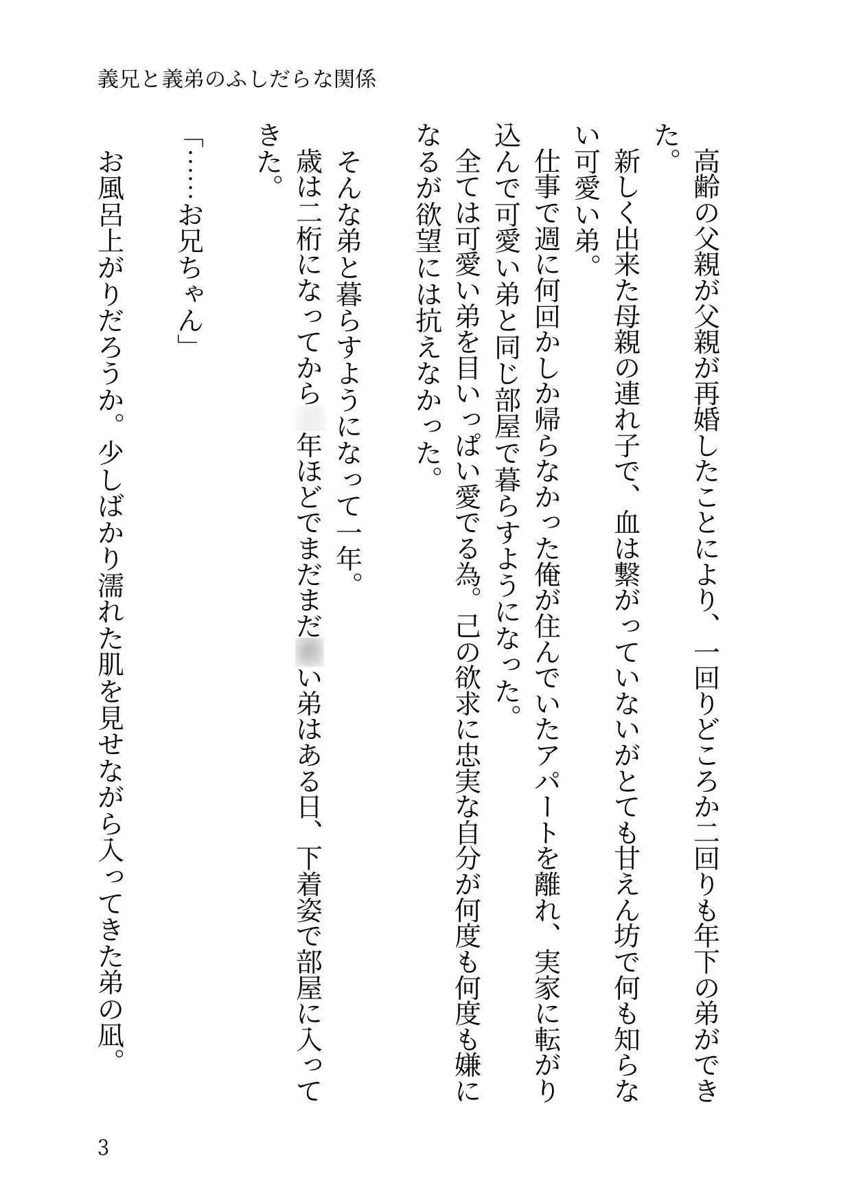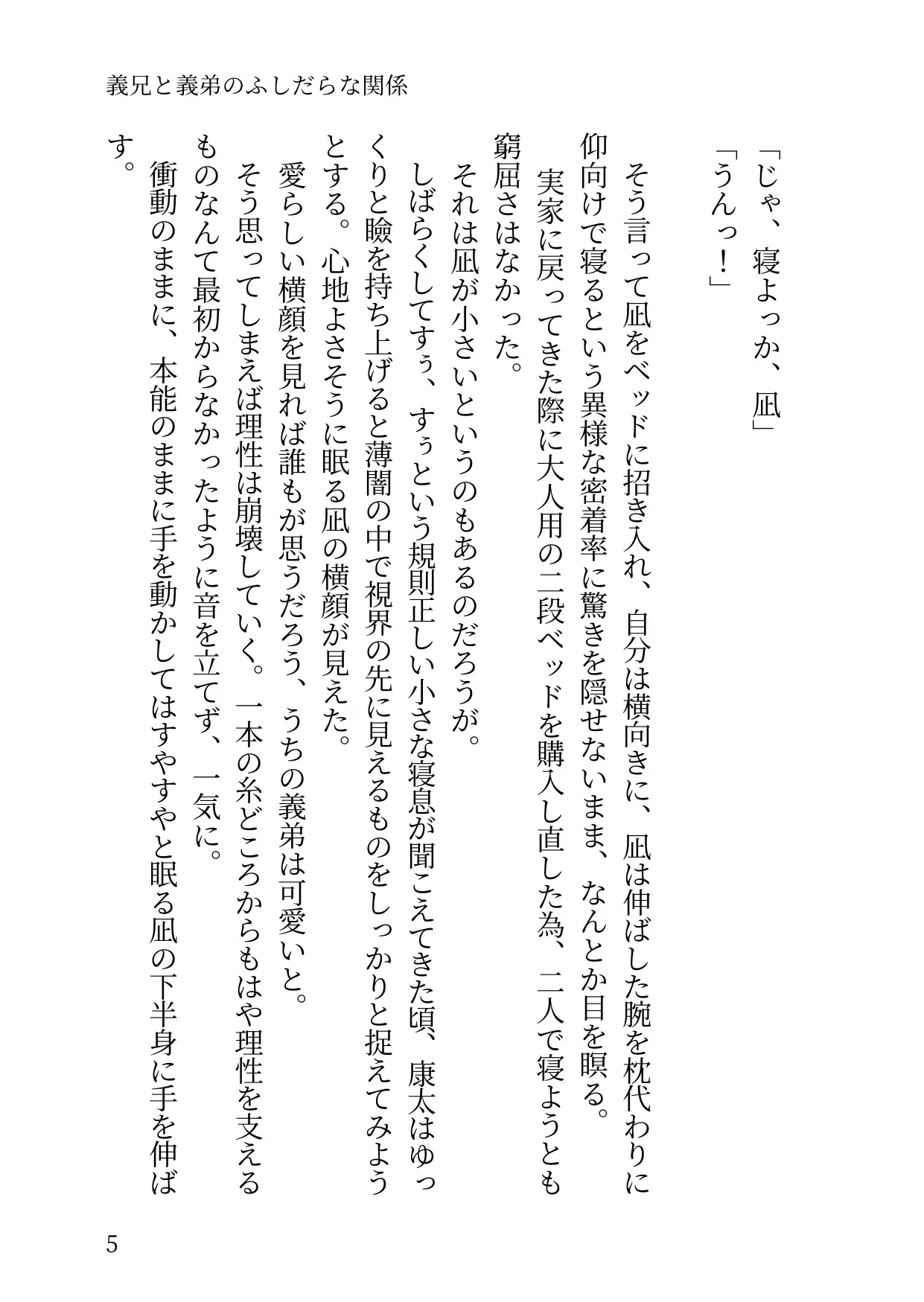 可愛い義弟と暮らす為に住んでいた家を引き払い、実家に帰ってきた康太は日々、凪を見る為に欲情し、理性を抑えるのに必死という幸せな日々を送っていた。そんなある日、部屋に休んでいるところに明らかにお風呂あがりだと分かる舌き姿で格好で凪が訪ねてきて「一緒に寝よう…?」と誘ってきた。