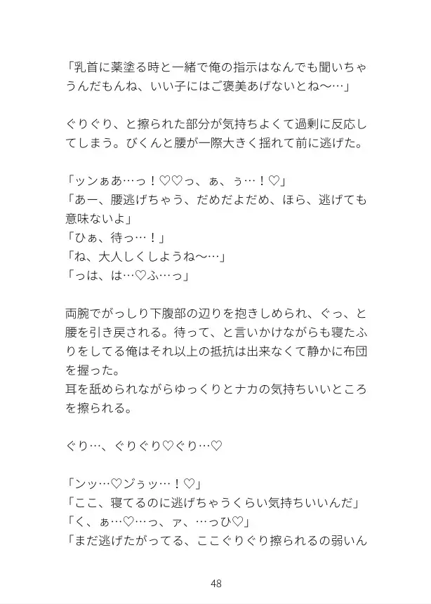 開発バレしてない日中に、薬だと嘘つかれて日焼け止めをぬりぬりコリコリ、感じちゃって抵抗しても「薬塗ってあげてるんだよ?君の為だよ、我慢我慢…」と腕押さえ乳首こりゅこりゅされたり、薬塗りのコツと嘘つかれて自分で乳首弄りさせられたり、薬塗るふりして腰ヘコ見せつけメスイキチクニーしたり(オナバレしてないと思ってる)、通話越し乳首弄り指示されながら攻めにチ◯コ扱き音聞かせる受けのオナニー(オナバレしてないと思ってる)もあります。