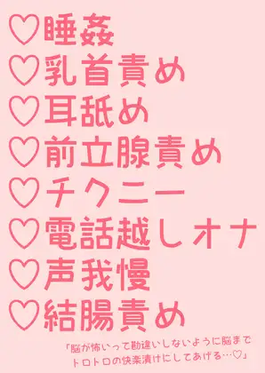 睡姦/乳首責め/耳舐め/耳責め/前立腺責め/チクニー/電話越しオナニー/声我慢/結腸責め約30000文字
