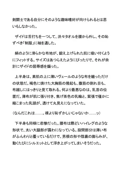 コロシアムで無敗を誇る国最強の剣闘士・ザイド。その勇姿を見初めた国王に招かれ、王城での親衛隊任命を受けることになる。しかし、与えられた制服は乳首も股間も透けて見える、踊り子のような薄布一枚の淫らな衣装だった。待ち受けていたのは、護衛任務という名の性処理係としての生活。 好色な老王のねっとりとした手つきと巧みな舌技によって、未開発だった乳首は性感帯へと作り変えられ、触れるだけでイキ狂う「淫乱なメス」へと堕とされていく。