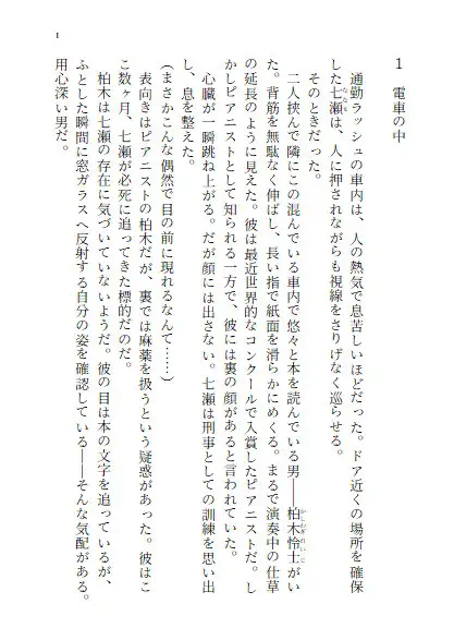 ある日、刑事の七瀬は電車で事件の関係者として追っているピアニストの柏木を見つけてしまう。