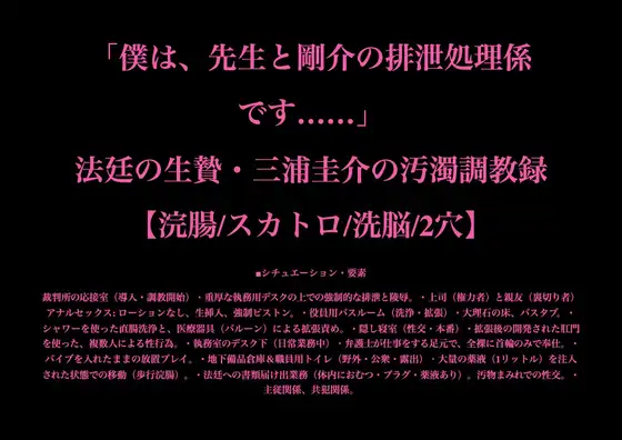 その日から、地獄の調教が始まった。 応接室のデスクで、親友に見守られながら行われる公開浣腸。 高級バスルームでの限界拡張と、強○的な排泄管理。 そして、法廷という神聖な場でのおむつ装着業務――。「剛介……剛介……!」