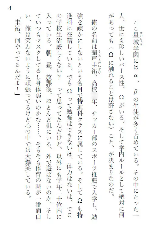 学園唯一のΩ・赤城華には、「誰も触れてはいけない」という厳格なルールがあった。孤独を受け入れるしかないはずの彼に、密かに心を寄せるα・諸戸圭祐。サッカー部のエースである彼は、どうにか赤城に近づこうと放課後にデートを仕掛け、諦めることなく想いを伝え続けていた。ある日、諸戸は神の使いである仔丸を助けたことから、不思議な力〈読心術〉を得る。赤城の本音を知ることができるようになった諸戸は、閉ざされた心の奥に触れていく。そして「参加できない」とされていた修学旅行へ、赤城を伴って同行することに成功するのだった。