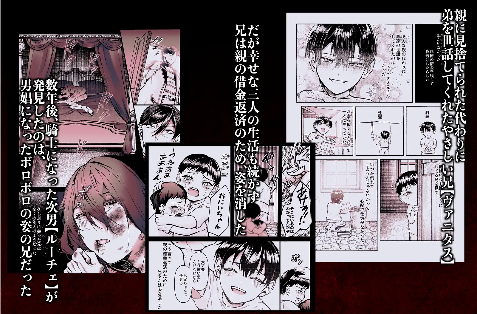 本当の思いを隠して相手の望むままに性行為をする元男娼の長男ヴァニタスと、兄を思うあまり暴走して乱暴に扱う次男ルーチェ、兄を道具のように遊ぶように扱う三男リヒトとの初めての兄弟セックスの話・弟×兄の近親相○