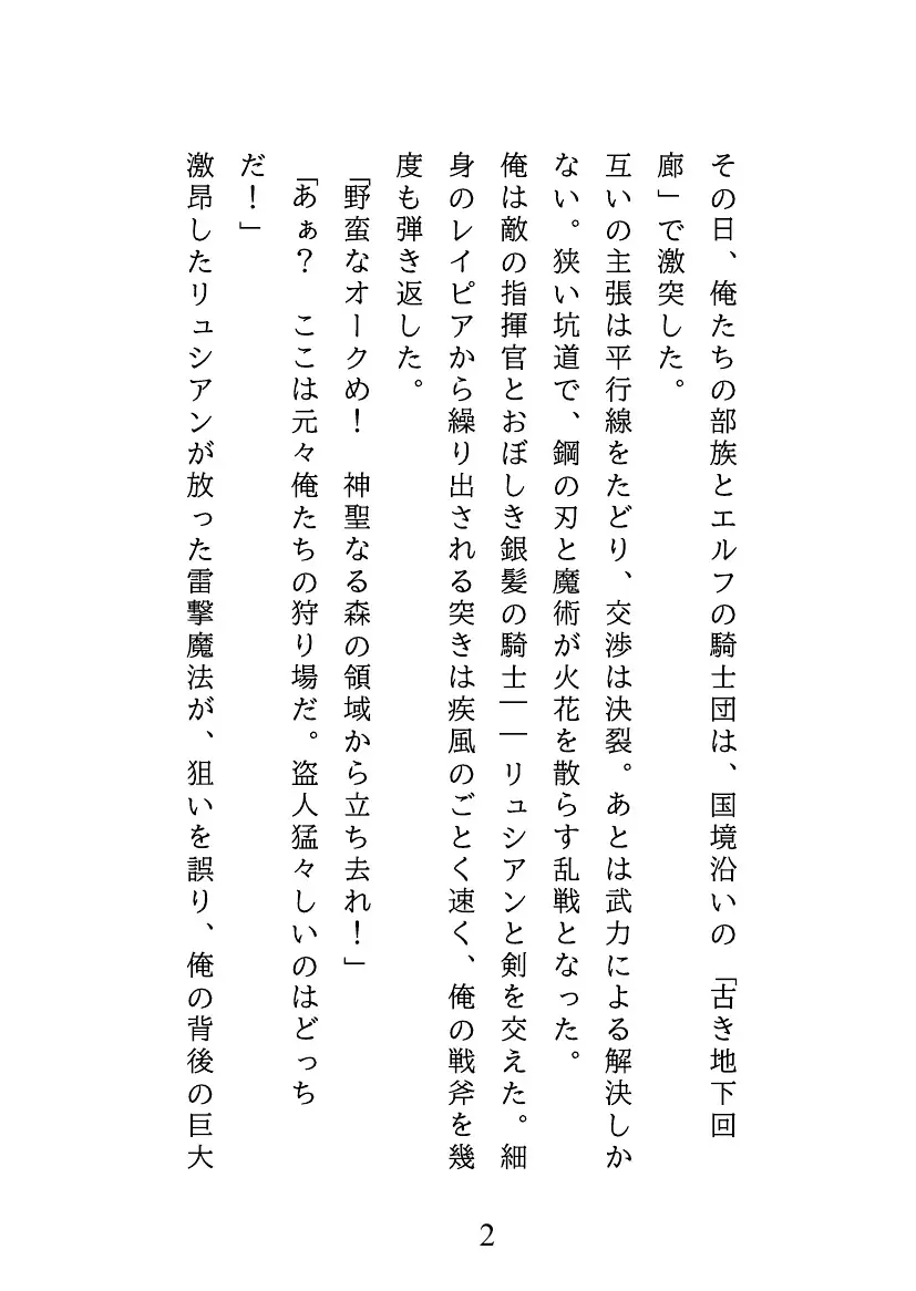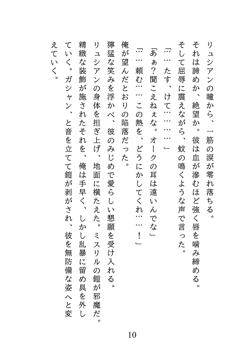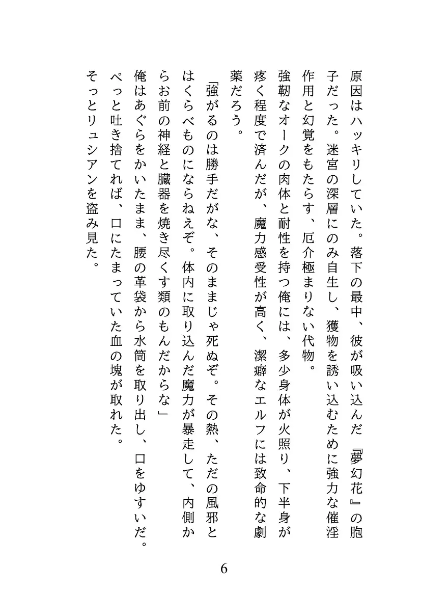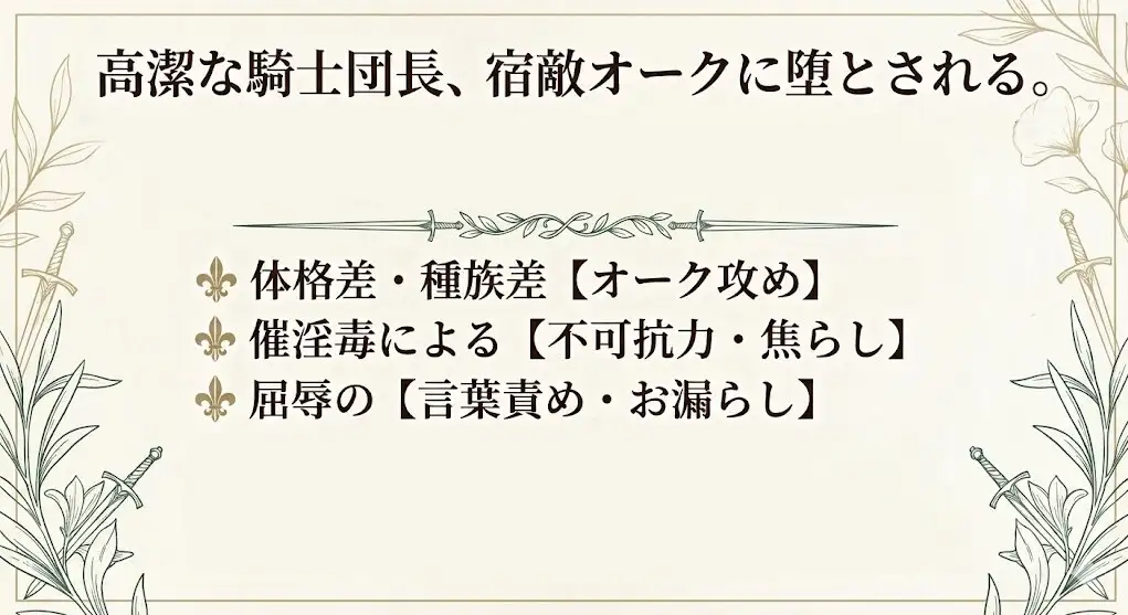 エルフの騎士リュシアンは、宿敵オークのグロムと遭遇。乱戦さなか共にダンジョンの底に滑落してしまう。 脱出不能な地下で、リュシアンは強力な催淫効果を持つ「夢幻花」の花粉を吸い込み、魔力暴走の危機に陥る。