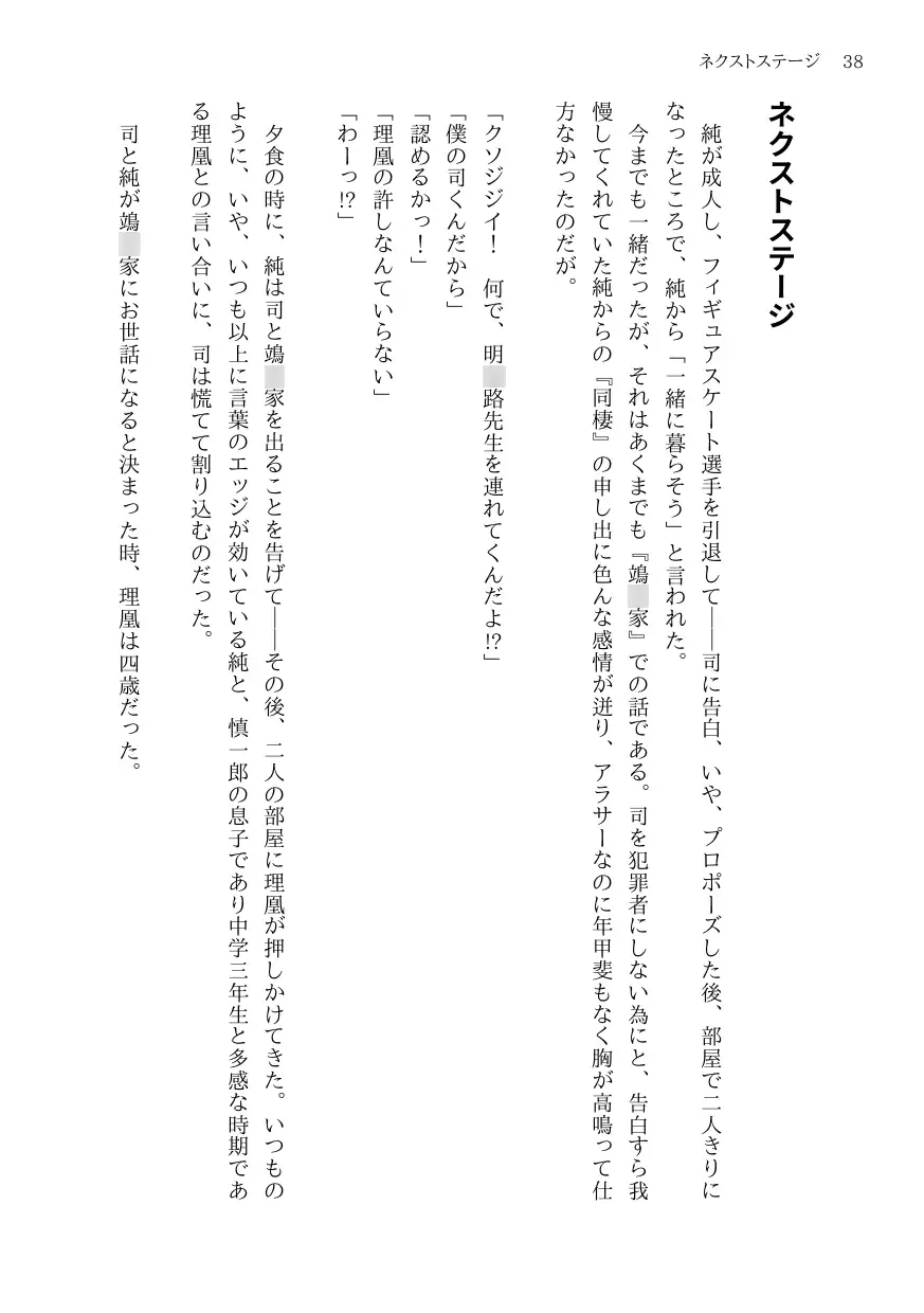 祖母の介護の為、一人横浜にやってきた十六歳の司が、もうすぐ七歳になる純の才能に気づき、綺麗に踊る彼の望むまま、スケートをさせようと奮闘する話。よだつかです。A5サイズで56ページ。上記シリーズの再録と、4ページですが書き下ろしあり(バンケットの前後の話で、純君一人称です)