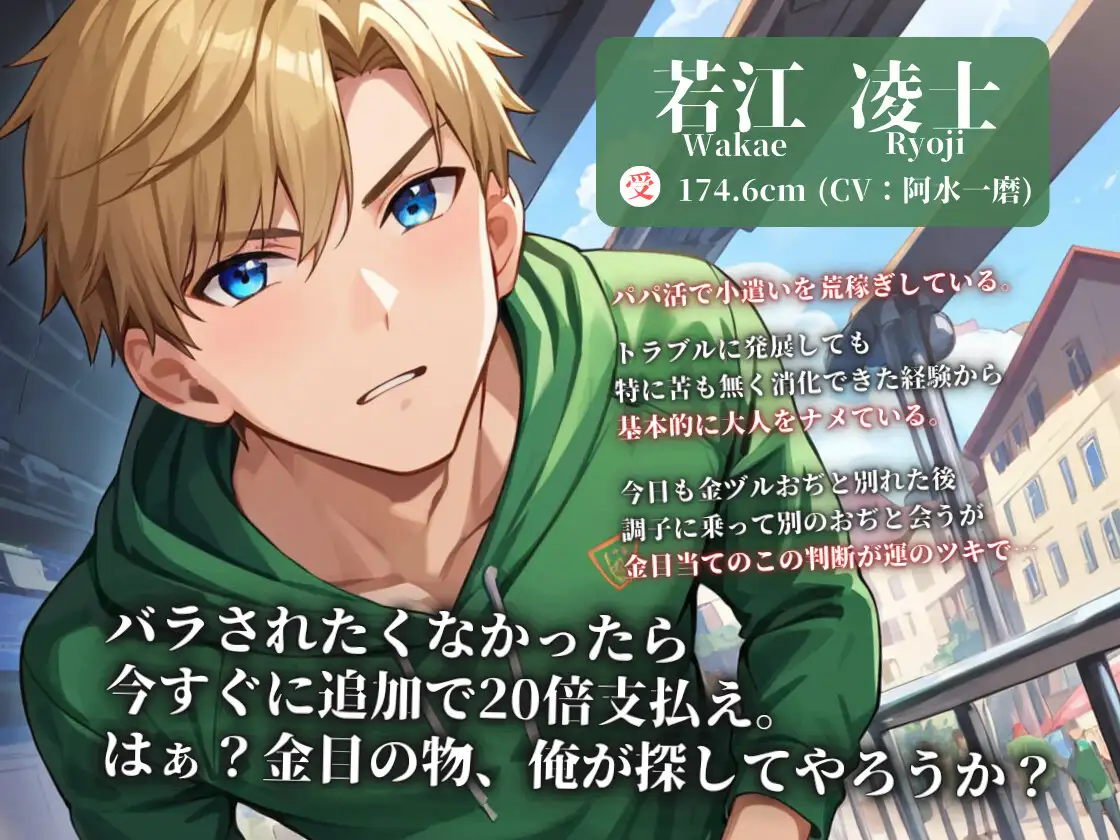 【受け】生意気パパ活男子 CV:阿水一磨学校ではごく普通の陽キャ男子だが、小遣い稼ぎとして常習的にパパ活をしている。