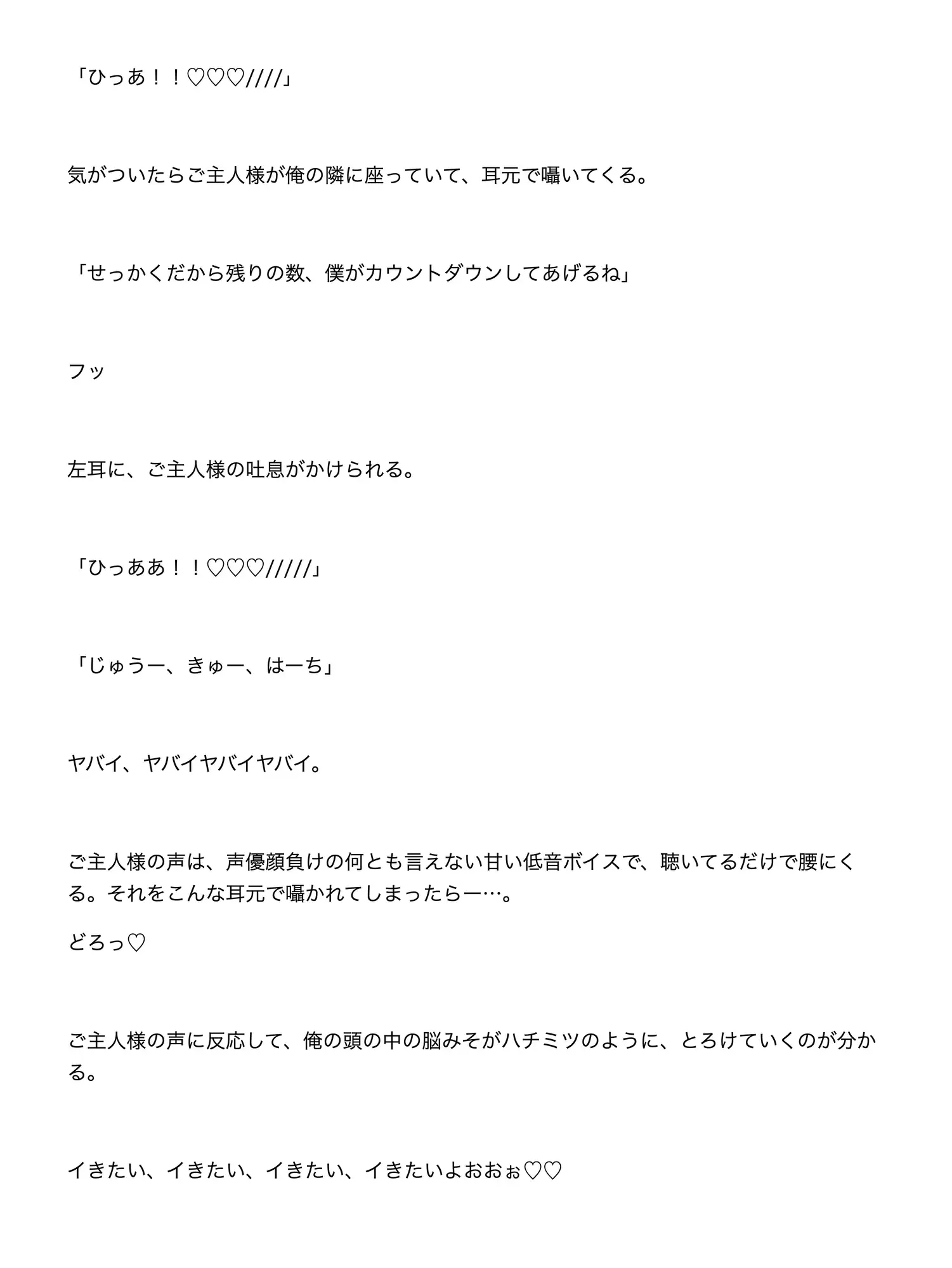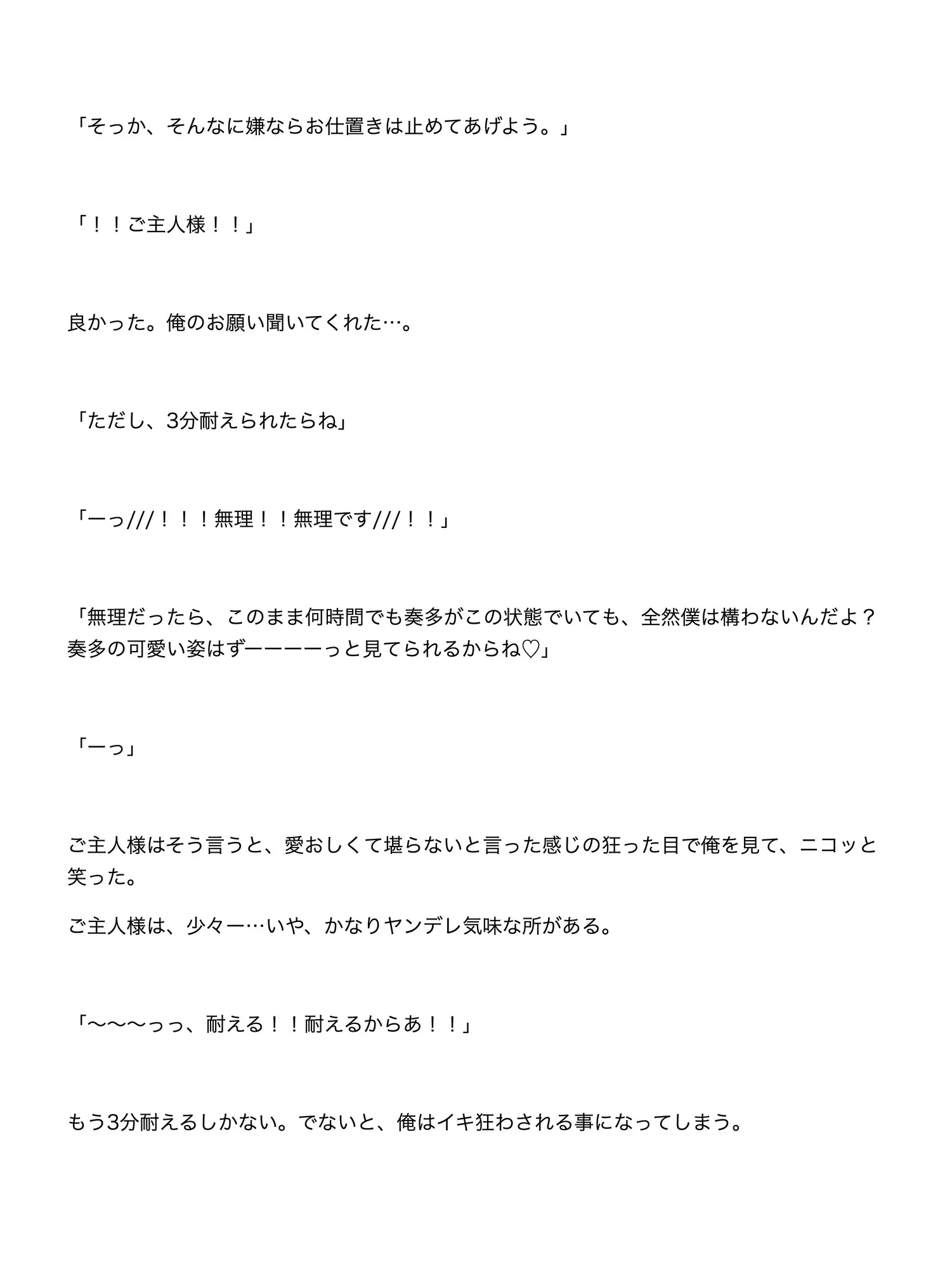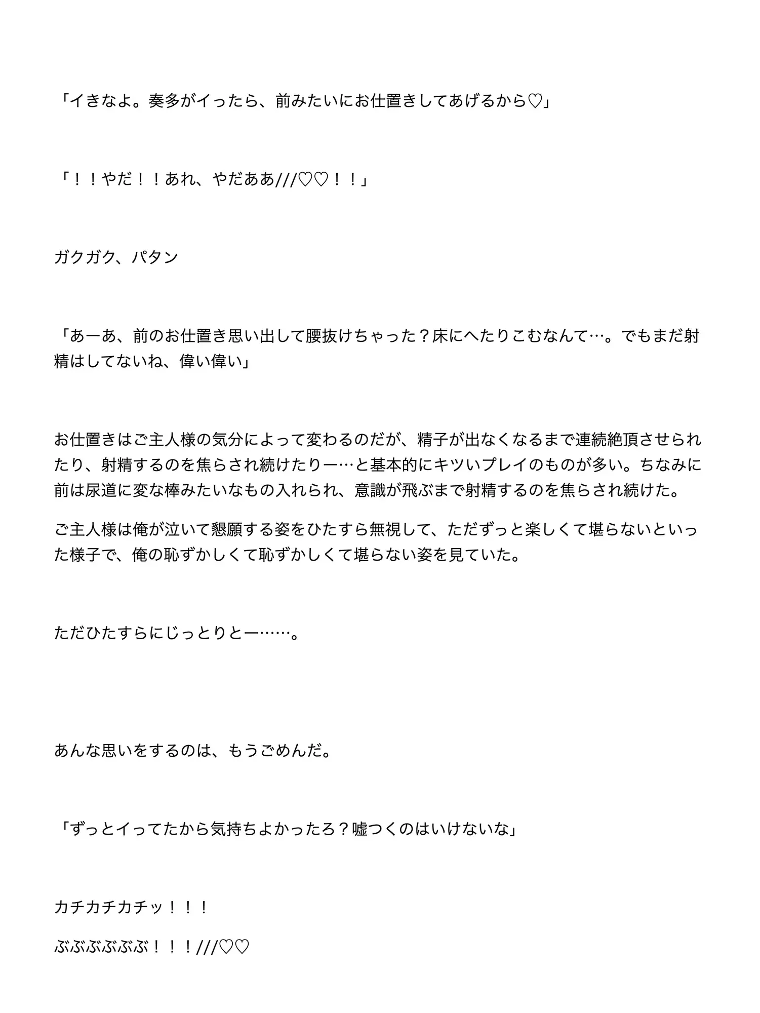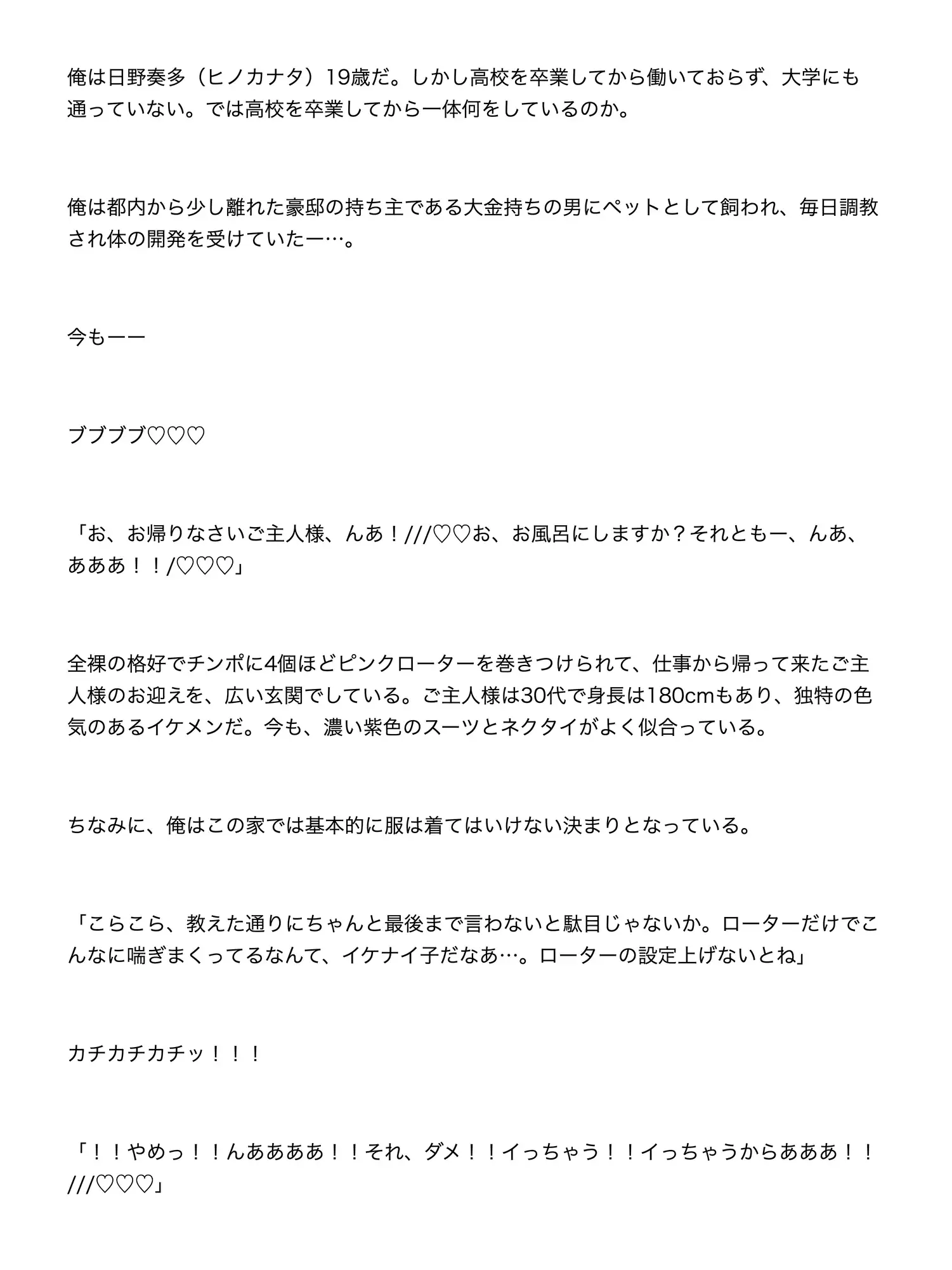 少年がお金持ちのご主人様に拾われて調教され、複数の男達と輪○したり、ローターや薬を使われたりして、メス落ちするBL小説となっています。ご主人様の主人公に対する愛情表現が歪んでいます。
