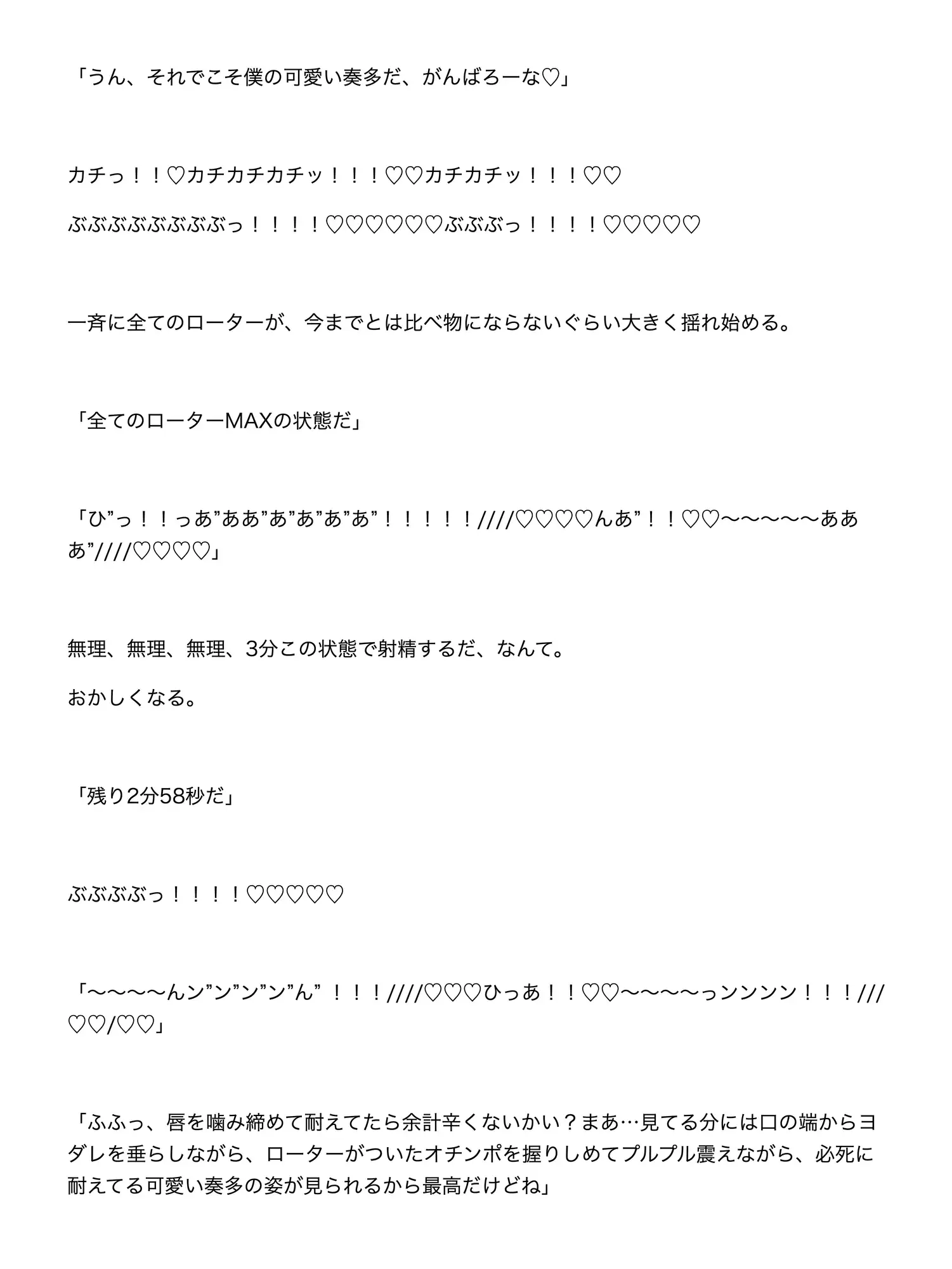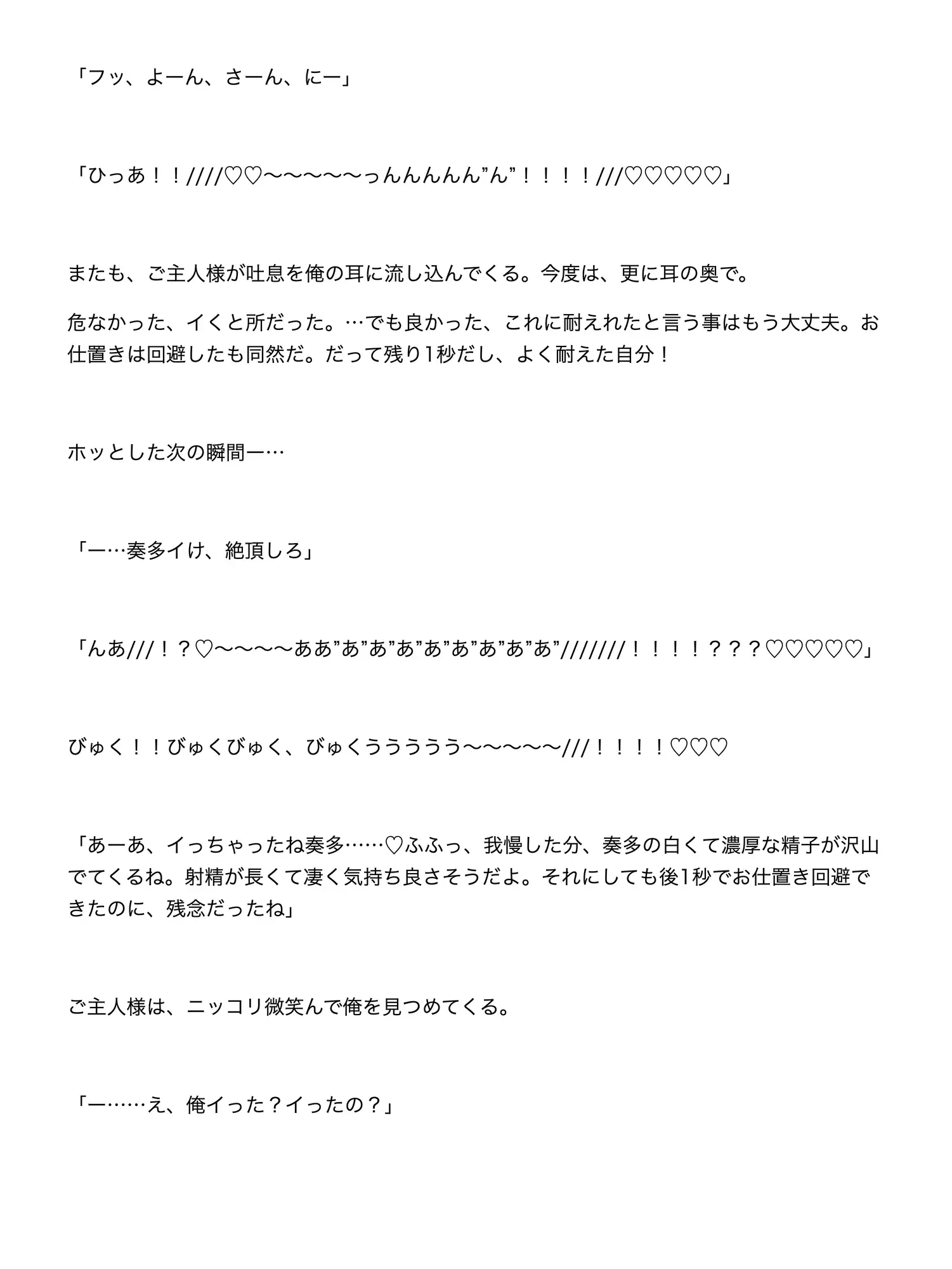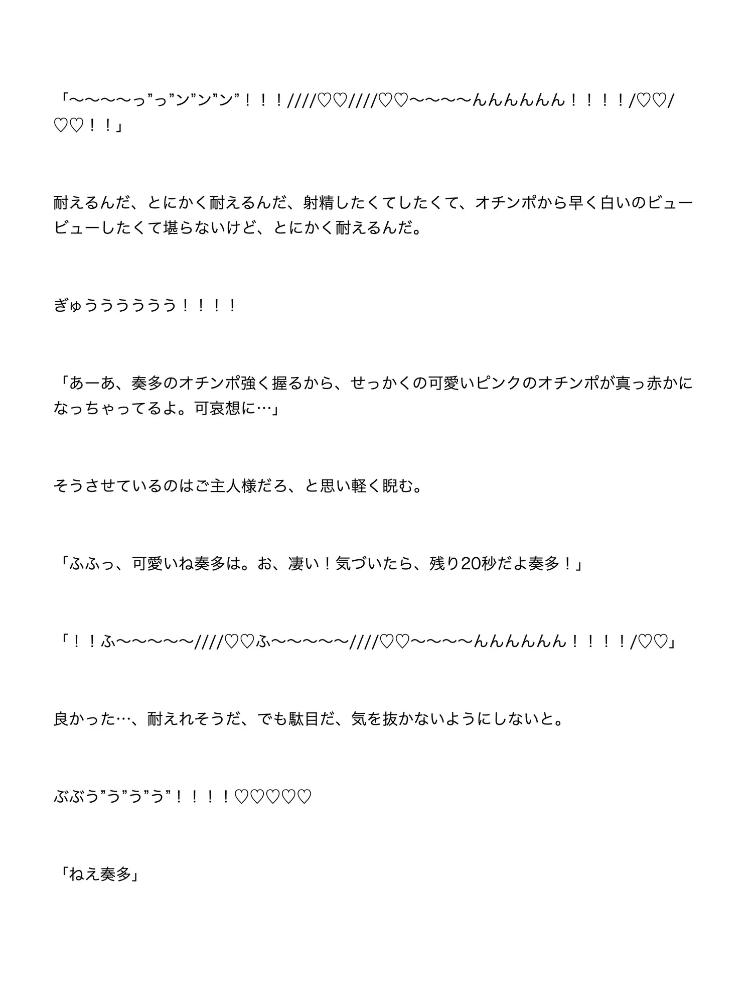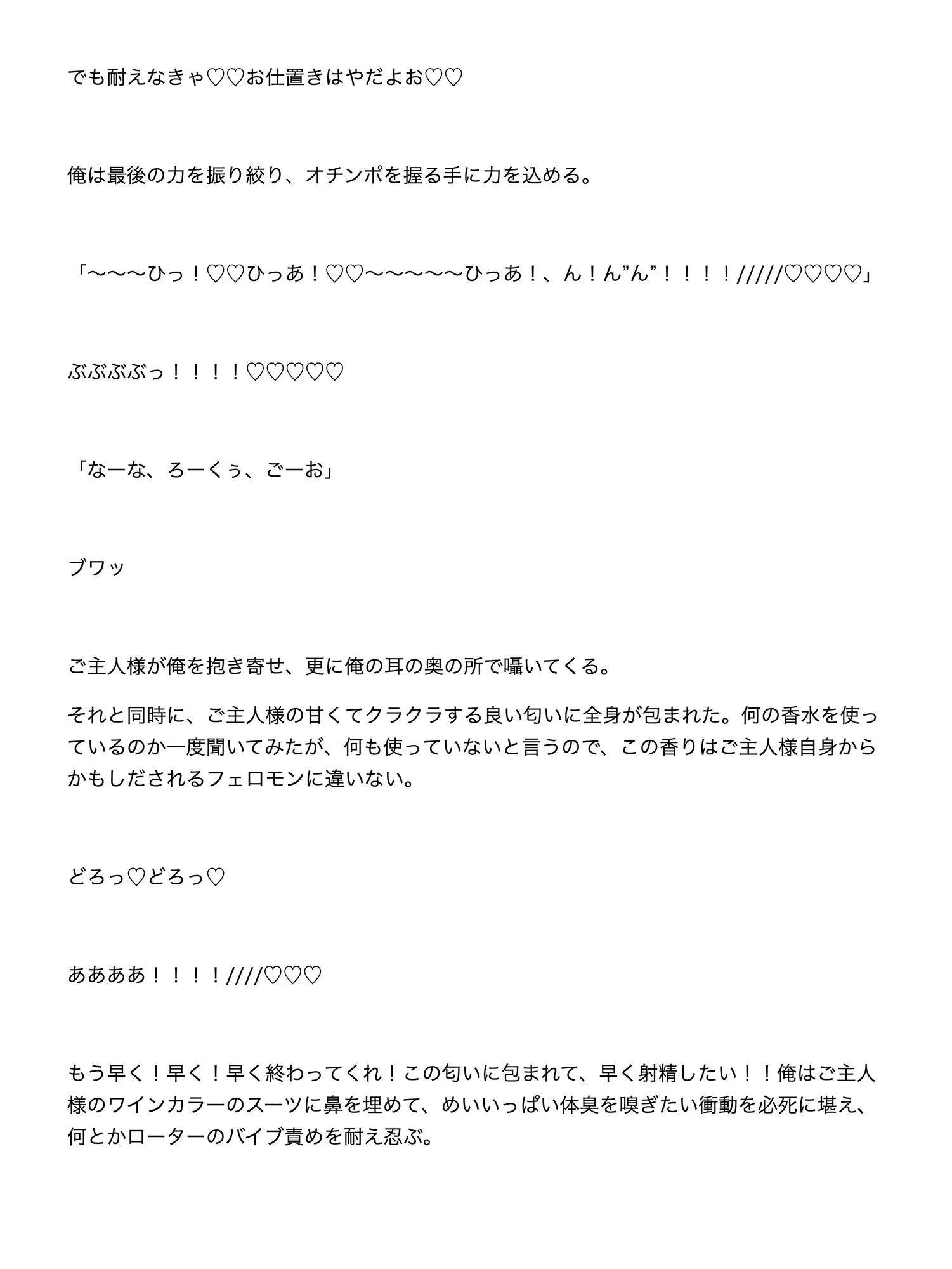 少年がお金持ちのご主人様に拾われて調教され、複数の男達と輪○したり、ローターや薬を使われたりして、メス落ちするBL小説となっています。ご主人様の主人公に対する愛情表現が歪んでいます。