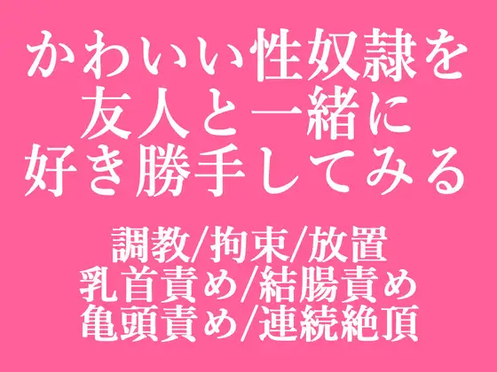 拘束/監禁/調教/連続絶頂/結腸責め/亀頭責め/前立腺責め/乳首責め/イラマチオ/放置/濁点喘ぎ/潮吹き/複数