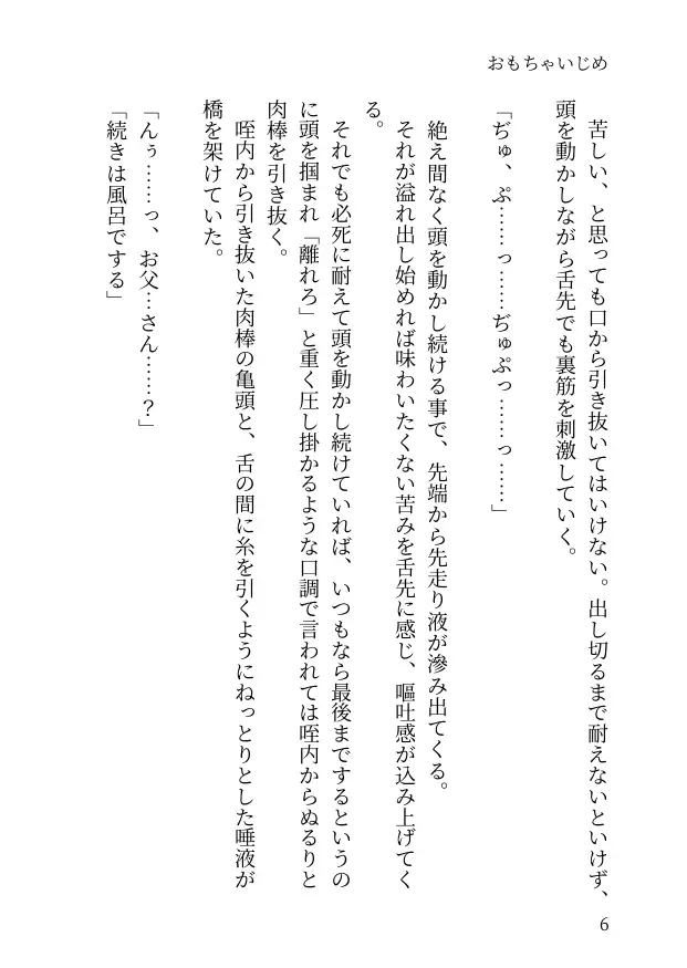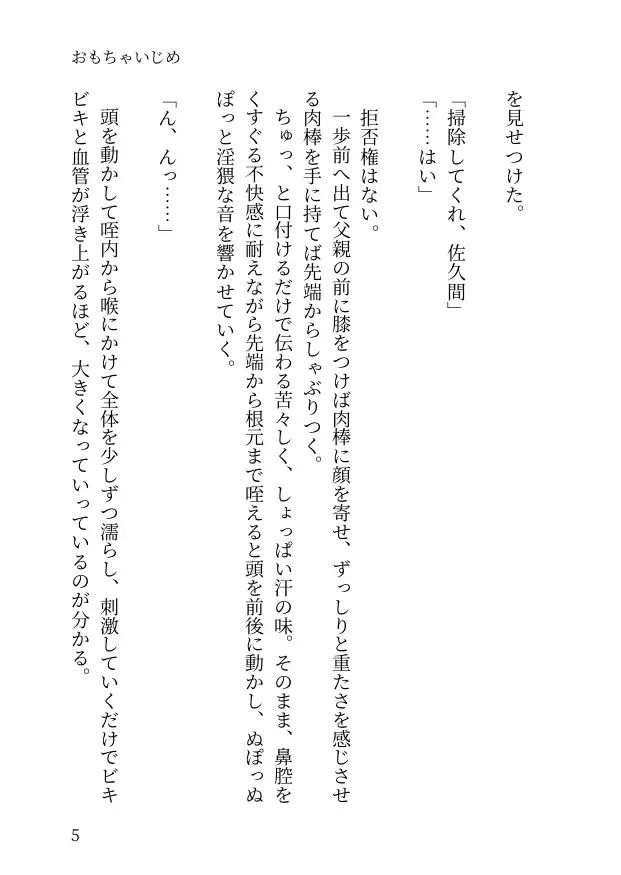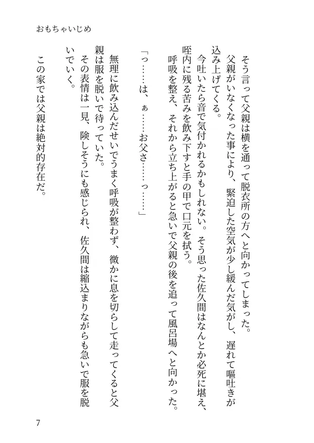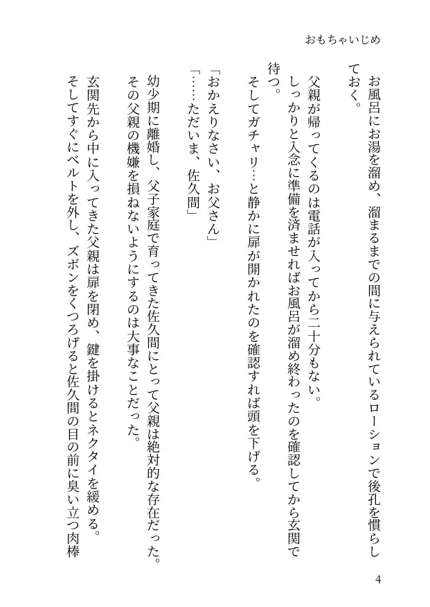 だが、それは佐久間にとって負担が大きいもので、その実態は父親の望む『性処理』をする事で……。知らず知らずに『父親は絶対』だと刷り込まされていき、快楽に溺れていく息子のお話。